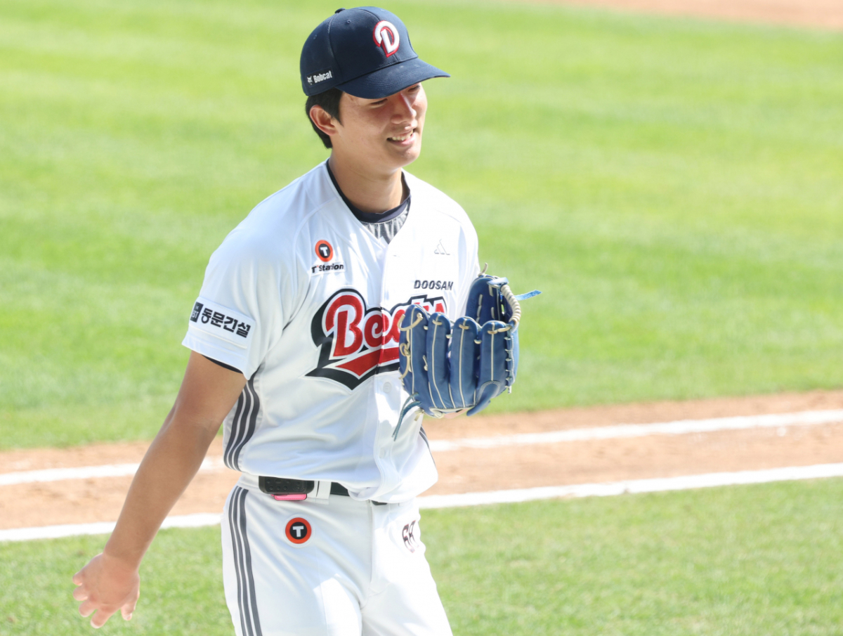 두산 선발 최민석이 5회 투구를 마친 후 더그아웃으로 향하고 있다.
