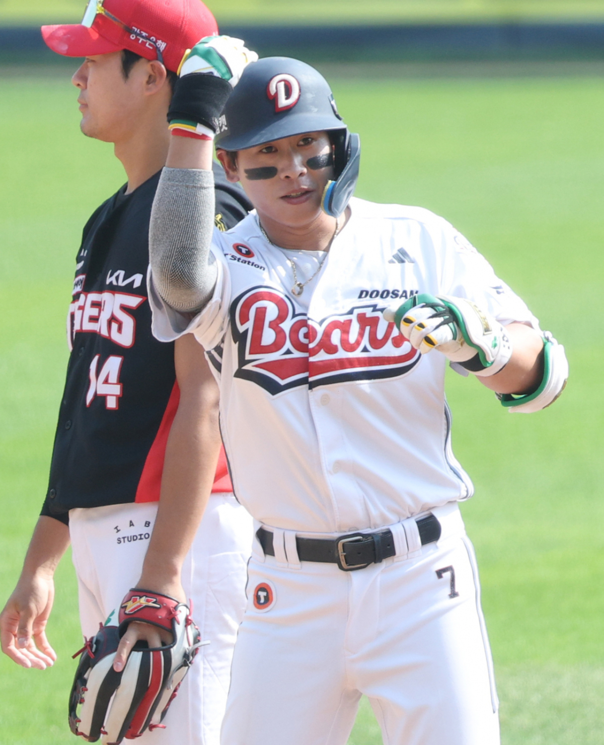 두산 박찬호가 5회말 무사에서 좌월 2루타를 날리고 출루한 후 세리머니를 하고 있다.