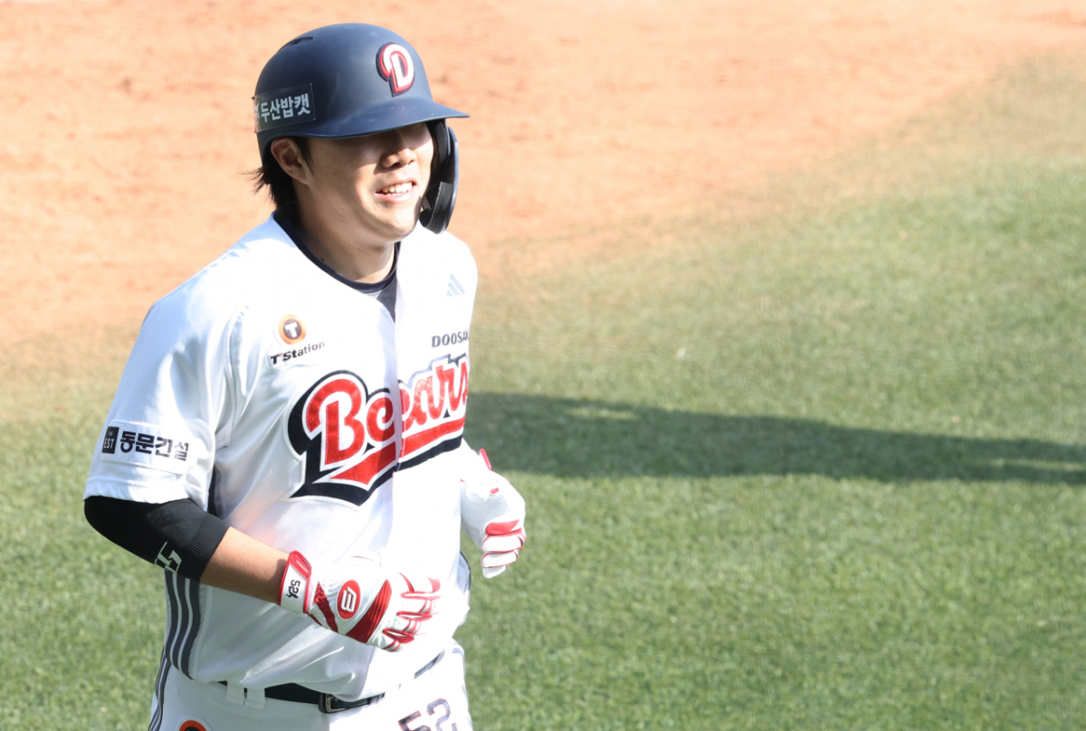 두산 박준순이 7회말 무사에서 좌중월 1점 홈런을 날리고 홈인하고 있다.