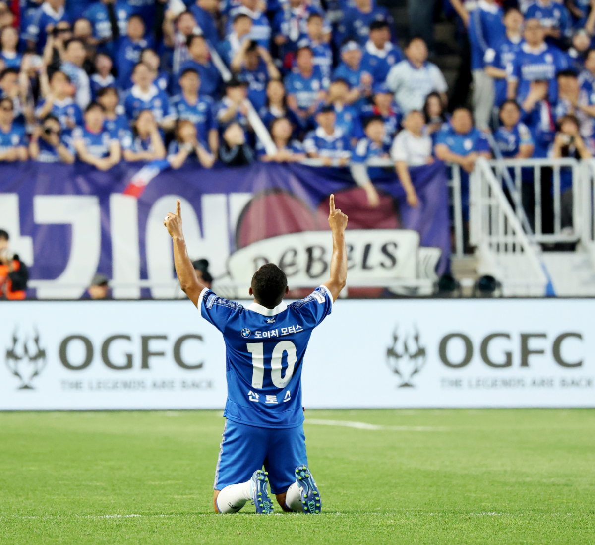 수원삼성 레전드 산토스가 19일 수원 월드컵경기장에서 열린 OGFC와 수원삼성의 레전드 매치에서 선제골을 성공시켰다. 그는 선제골을 넣은 후 동료들과 기쁨을 만끽했다. 산토스는 하늘에 감사 인사를 했다.