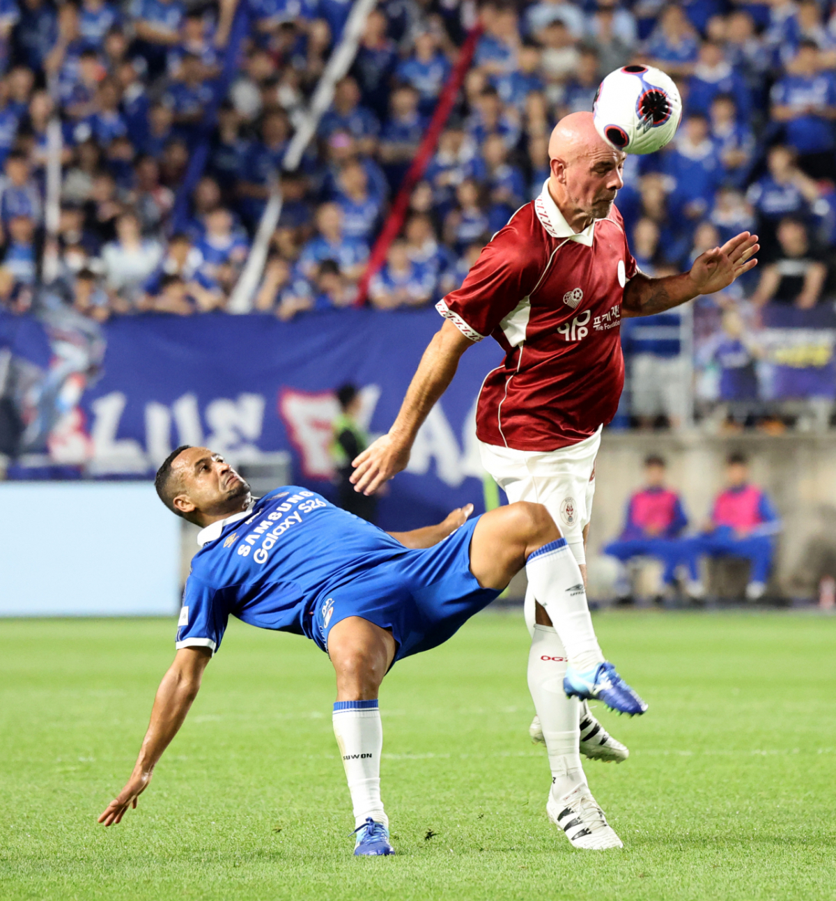 OGFC 깁슨이 19일 수원 월드컵경기장에서 열린 OGFC와 수원삼성의 레전드 매치 후반에 데니스와 공중볼을 다퉜다. 이 경기는 치열한 공중전으로 진행됐다. 깁슨과 데니스는 공중볼을 두고 경쟁했다.