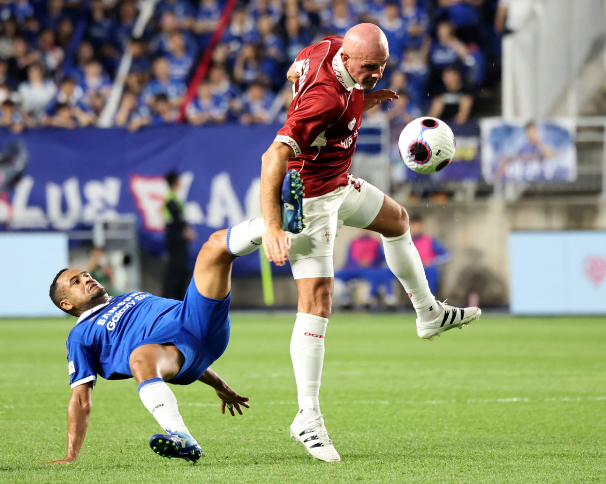 OGFC 깁슨이 19일 수원 월드컵경기장에서 열리는OGFC와 수원삼성의 레전드 매치 후반 데니스와 공중볼을 다투고 있다. 2026.04.19.