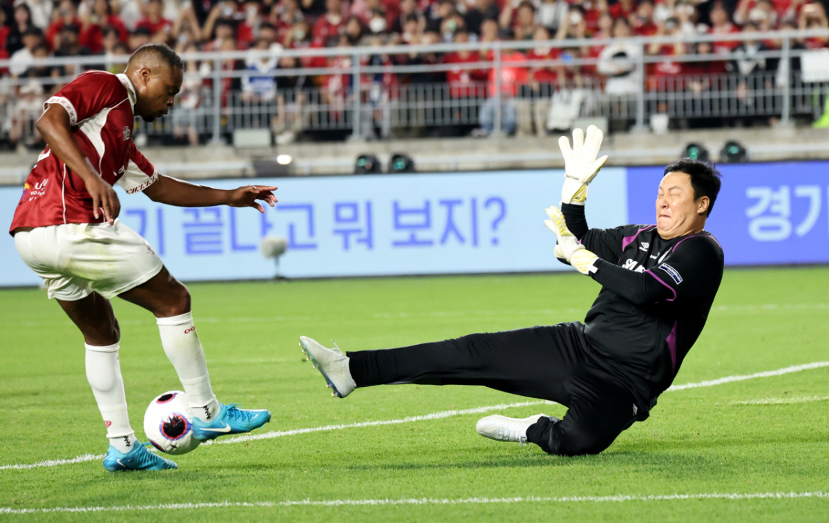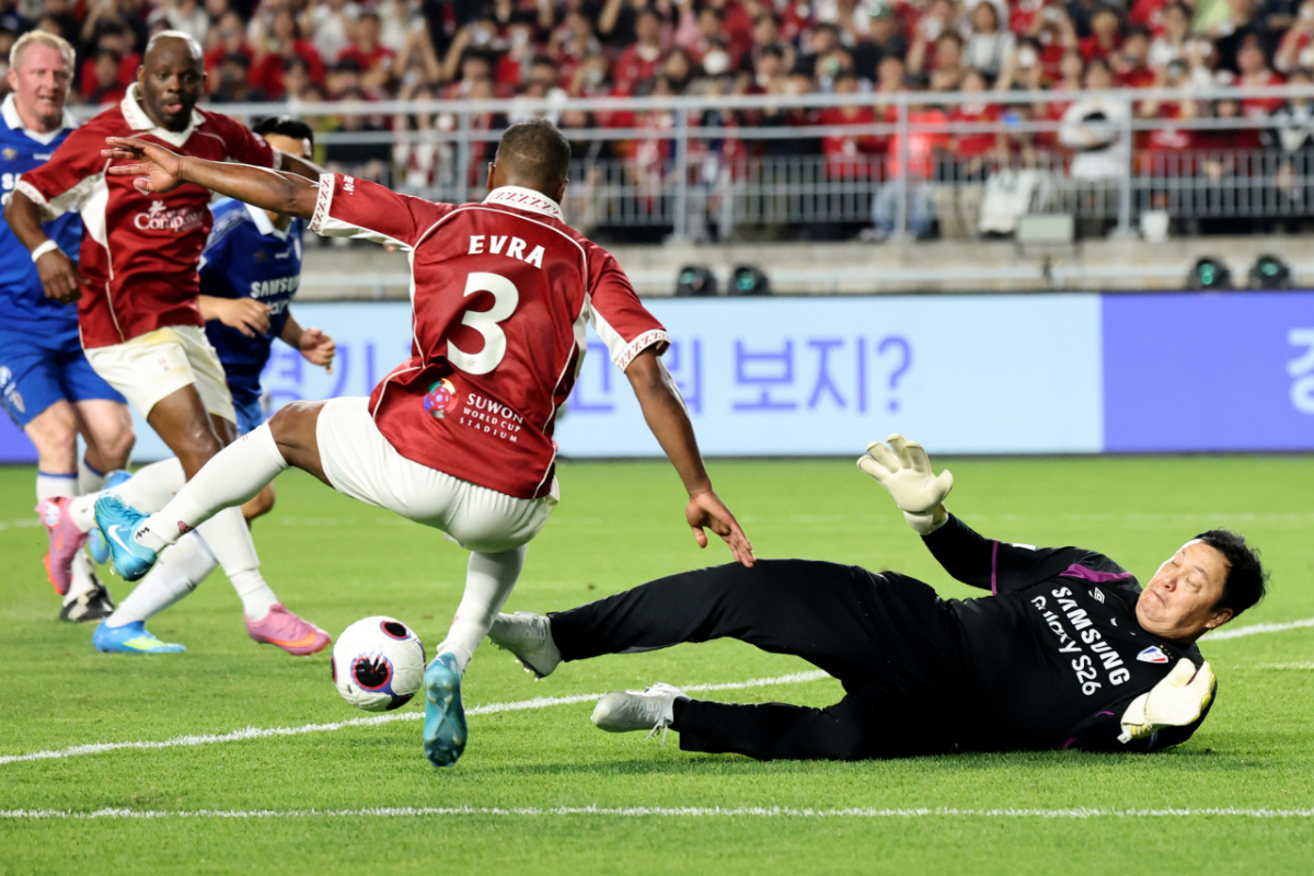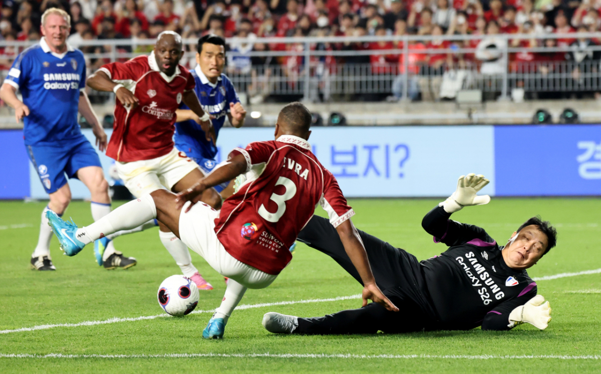 OGFC 에브라가 19일 수원 월드컵경기장에서 열리는OGFC와 수원삼성의 레전드 매치 후반 이운재 마크를 받으며 슈팅을 놓리고 있다. 슈팅도 실패했지만 오프사이드판정. 2026.04.19.