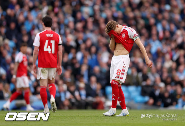 영국 '데일리 메일'은 20일(한국시간) 맨시티전 패배 직후 라이스가 외데고르에게 건넨 말을 조명했다. 방송 카메라에 그대로 잡힌 장면이었다.