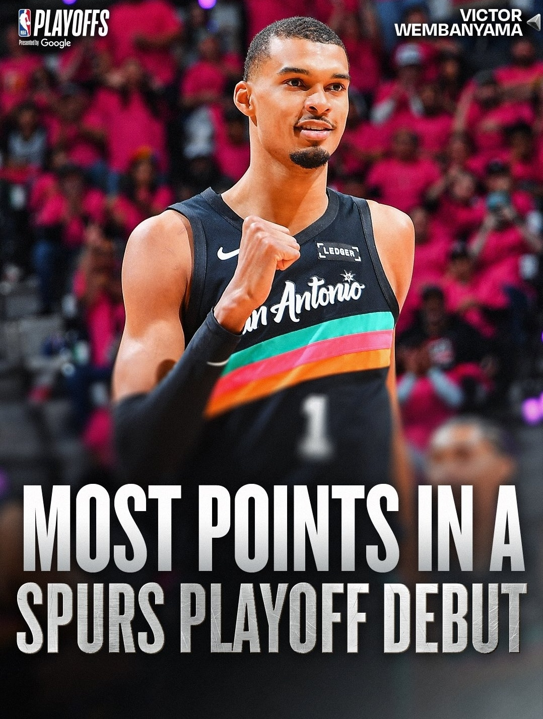 웸반야마가 올린 35점은 샌안토니오 구단 역사상 플레이오프 데뷔전 최다 득점 신기록이다. 종전 기록은 1998년 전설 팀 던컨이 세운 32점이었다. 또한 전반에만 21점을 몰아친 웸반야마는 플레이-바이-플레이 기록 집계가 시작된 1997년 이후 플레이오프 데뷔전 전반 최다 득점 기록까지 갈아치웠다.