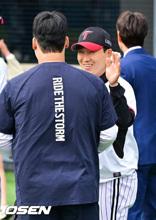 경기 앞서 LG 정수성 코치가 한화 강백호와 인사를 하고 있다. 2026.04.21 / [email protected]