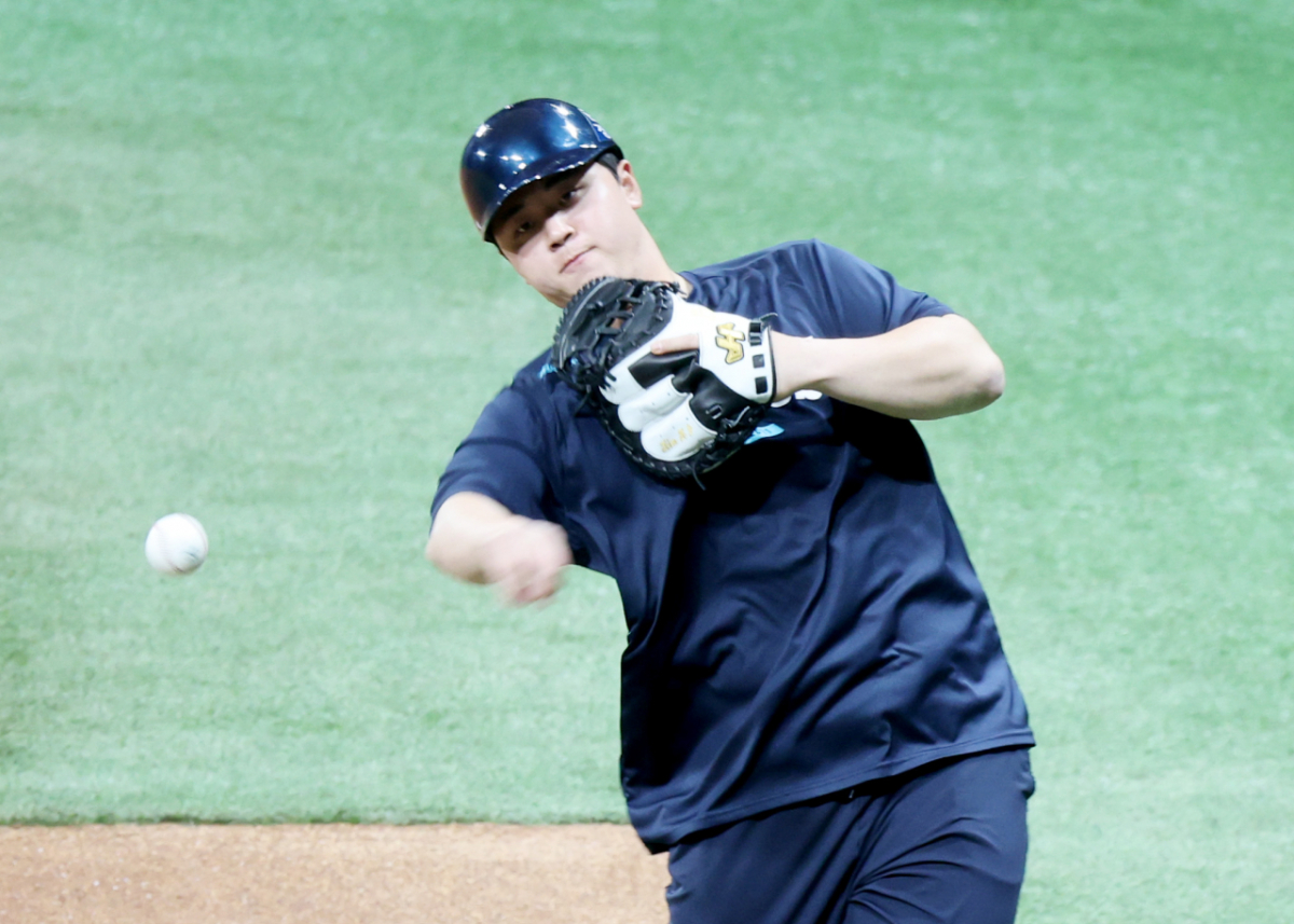 NC 포수 김형준이 21일 고척스카이돔에서 열리는 2026 KBO리그 키움히어로즈와 NC다이노스 경기를 앞두고 몸을 풀었다. 그는 캐치볼로 몸을 풀었다. 김형준은 '때론 사이드암으로' 공을 던졌다.