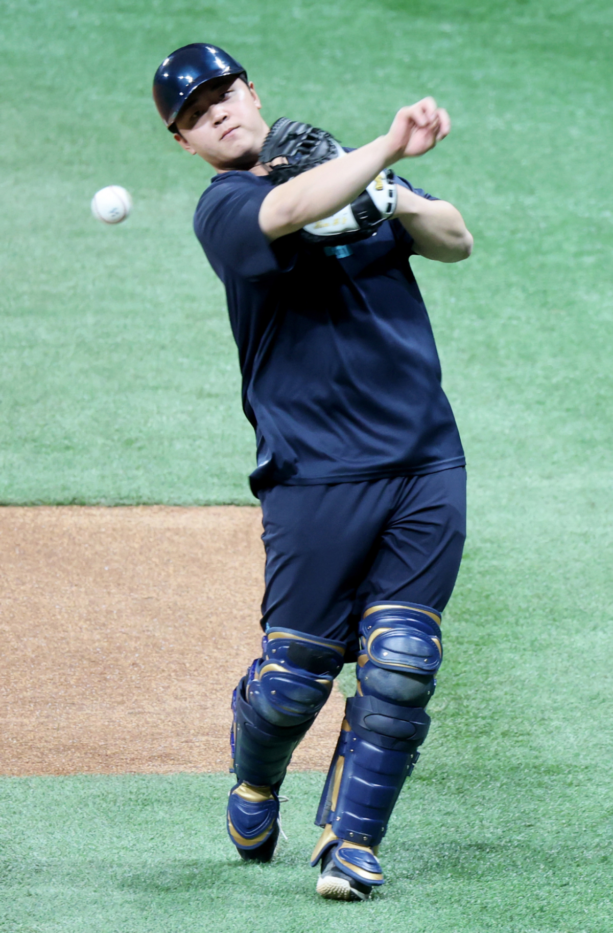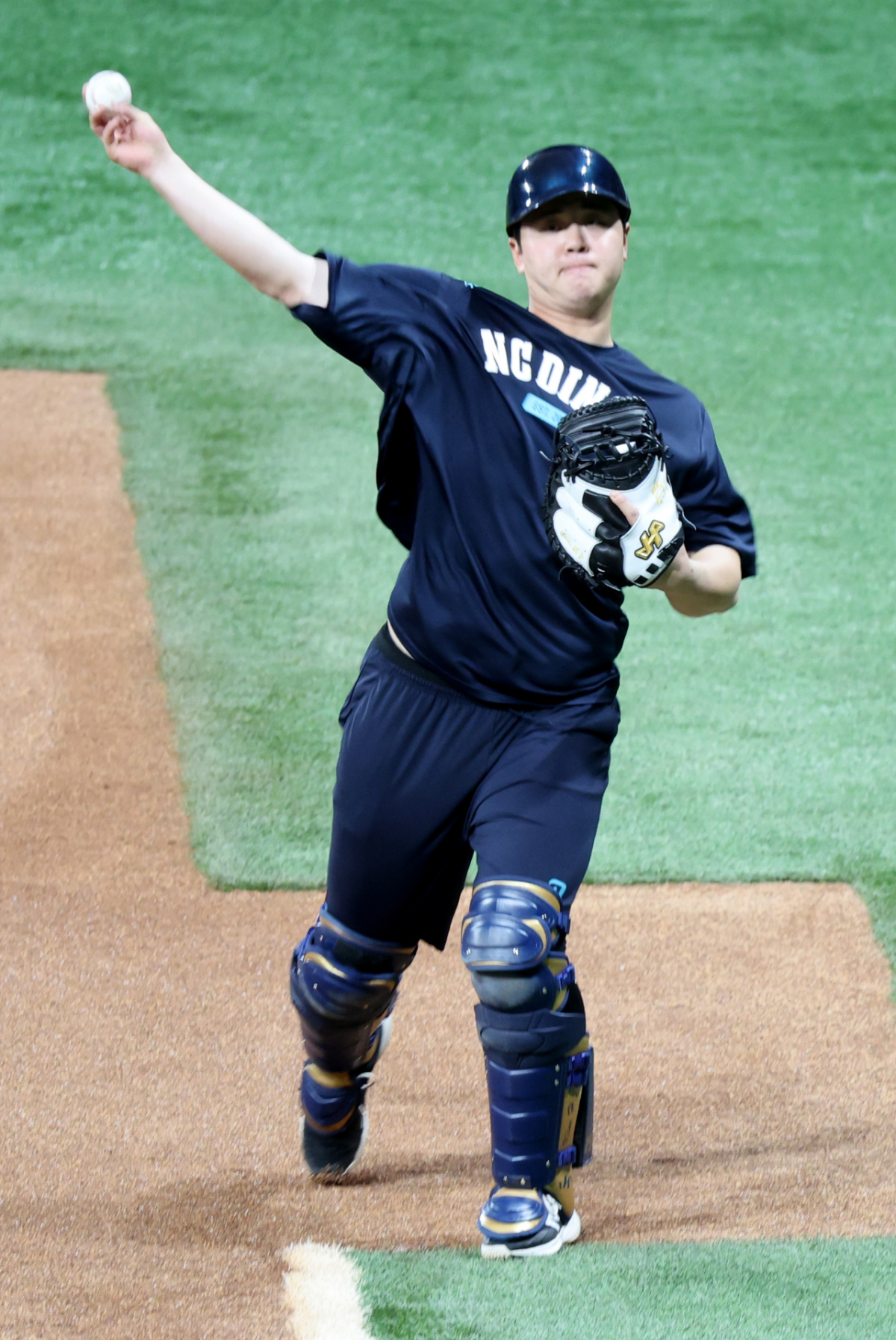 NC 포수 김형준이 21일 고척스카이돔에서 열리는 2026KBO리그 키움히어로즈와 NC다이노스 경기를 앞두고 캐치볼로 몸을 풀고 있다. 2026.04.21.