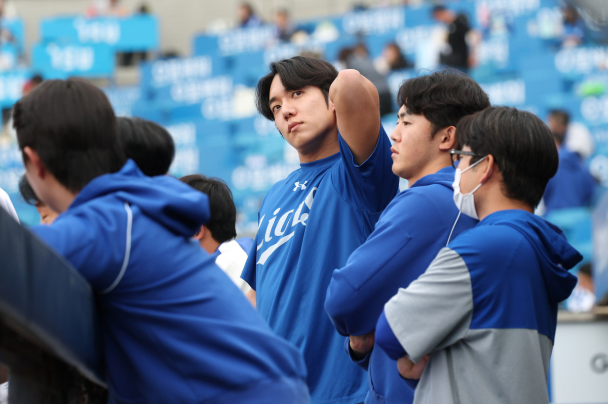 삼성 원태인이 더그아웃에서 경기 개시를 기다리고 있다.