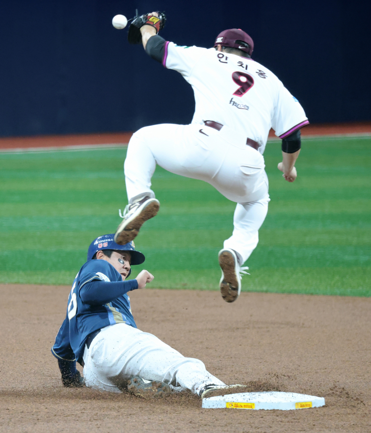 NC 6번타자 이우성이 21일 고척스카이돔에서 열리는 2026KBO리그 키움히어로즈와 NC다이노스 경기 2회초 견제구에 황급히 2루로 귀루하고 있다. 2026.04.21.