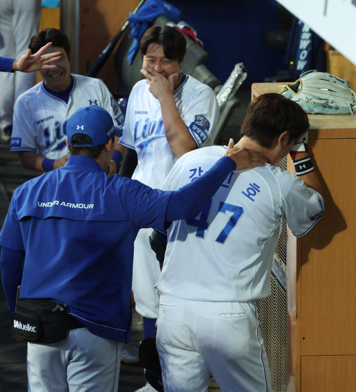 삼성 강민호가 2회말 2사 2루에서 선제 1타점 적시 2루타를 날리고 3루까지 내달렸으나 SSG 3루수 최정에 태그아웃됐으나 동료들의 환영을 받고 있다.