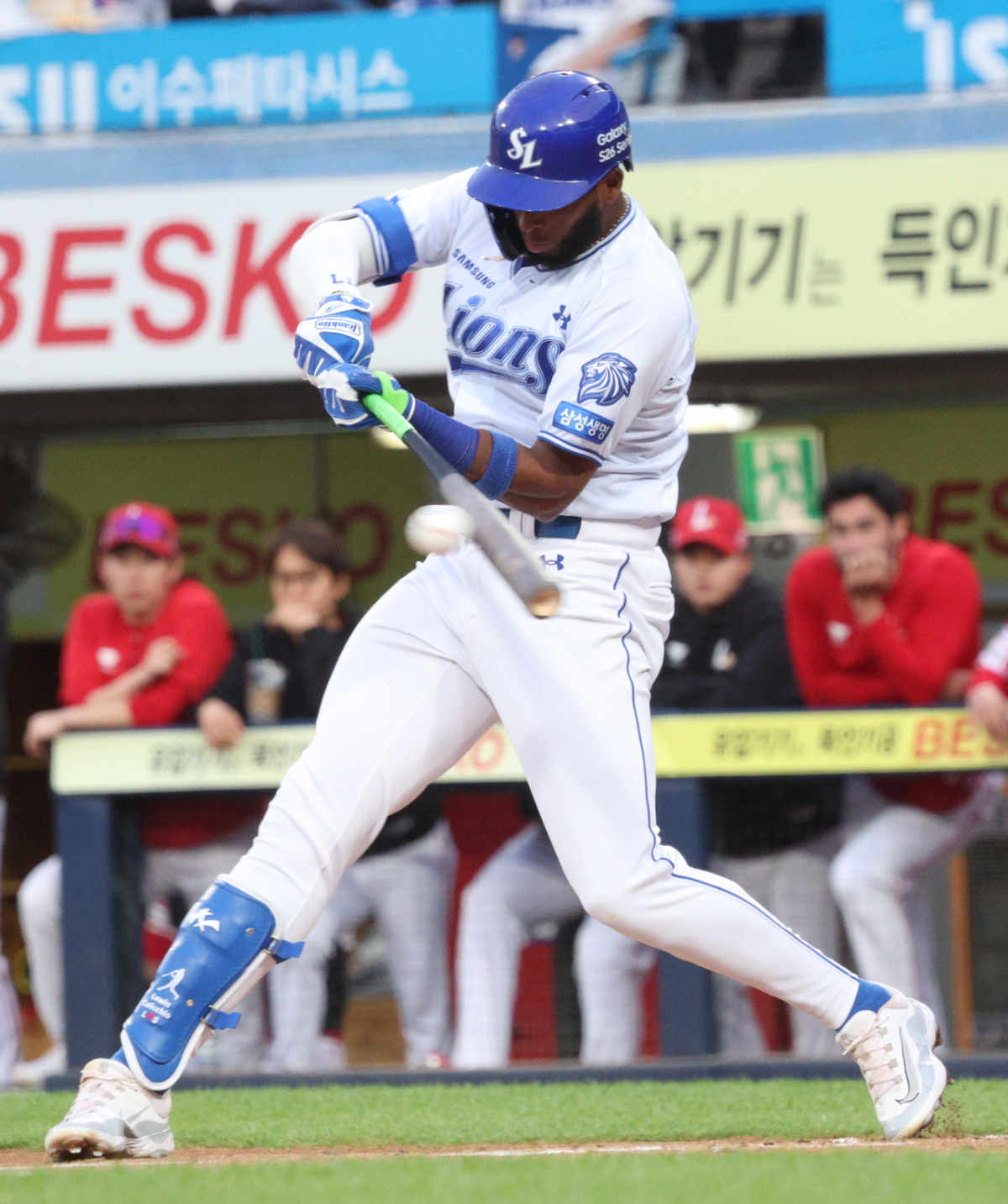 삼성 디아즈가 1회말 2사 1루에서 좌전 안타를 날리고 있다.