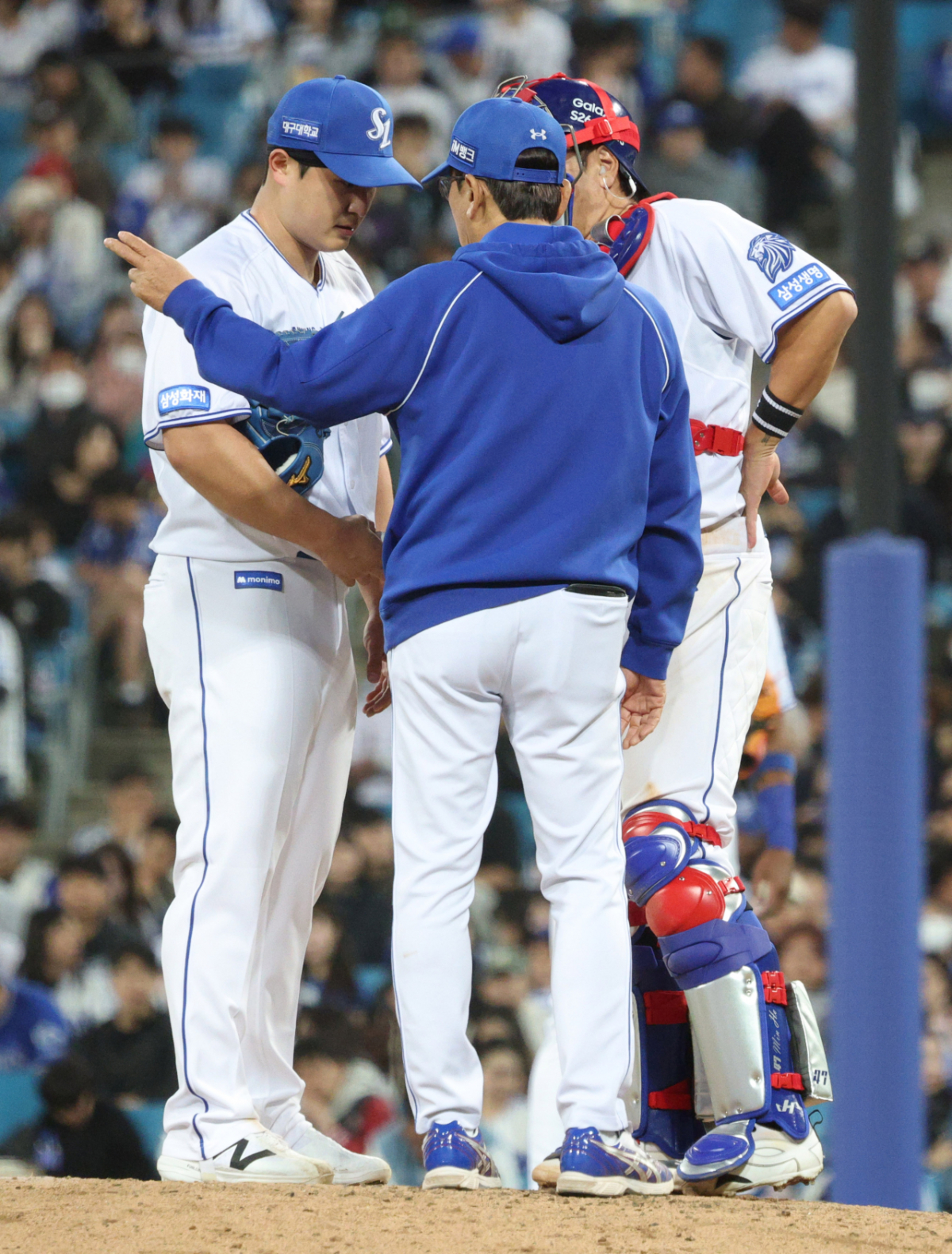 삼성 선발 최원태가 흔들리는 모습을 보이자 투수 코치가 마운드로 올라가 진정시키고 있다.