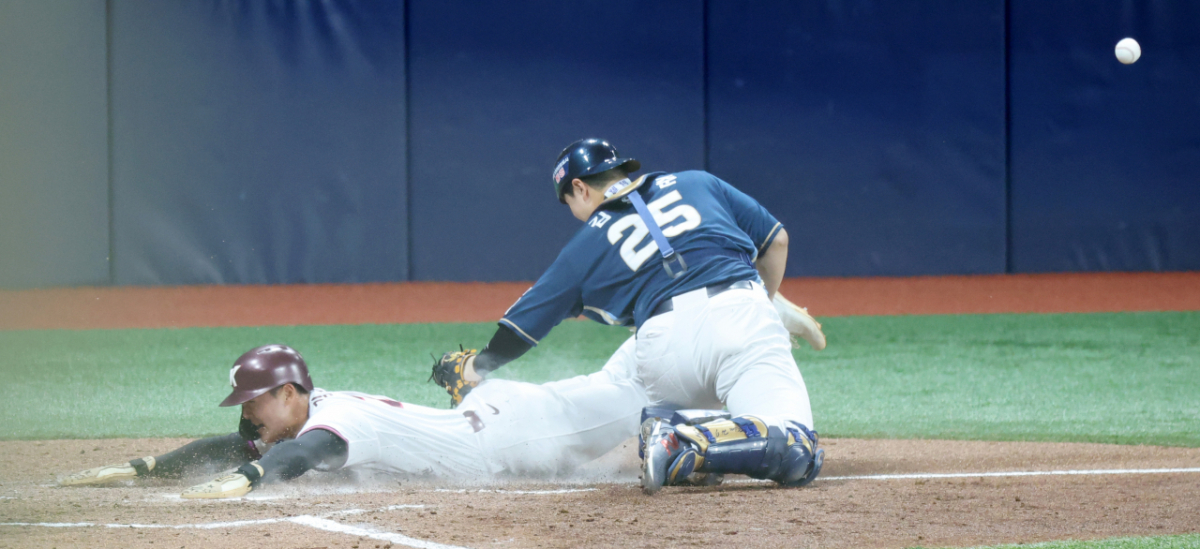 21일 고척스카이돔에서 열린 2026 KBO리그 키움히어로즈와 NC다이노스의 경기에서 키움 9번타자 김지석이 홈으로 쇄도했다. 김지석은 7회말 1사 1루 임지열의 2루타 때 홈까지 들어왔다. 그는 세이프 판정을 받았다.