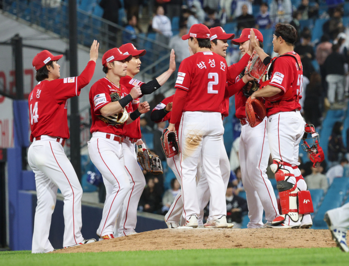 SSG 선수들이 연장 10회 끝에 삼성에 5-4로 승리한 후 기쁨을 나누고 있다.