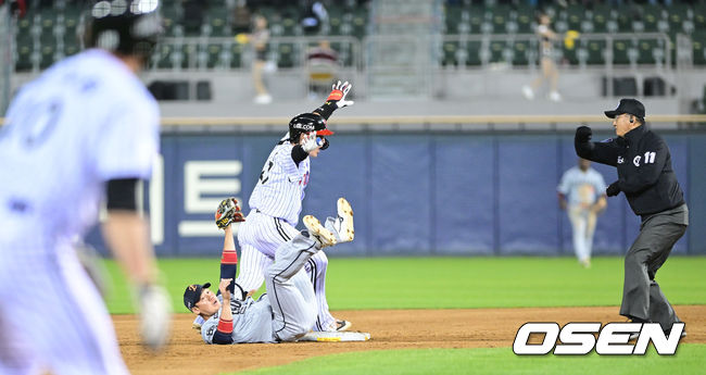 4회말 1사 1루 상황 LG 박동원이 안타를 날리고 상대 수비를 틈타 2루까지 뛰었지만 한화 2루수 하주석의 태그에 걸려 아웃되고 있다. 2026.04.22 / [email protected]
