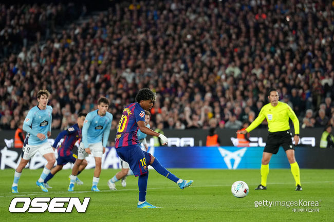 야말은 23일(한국 시간) 스페인 바르셀로나의 캄프 노우에서 열린 2025-2026 라리가 33라운드 셀타 비고와의 경기에서 전반 40분 침착하게 페널티킥을 성공시키며 팀의 1-0 승리를 이끌었다.