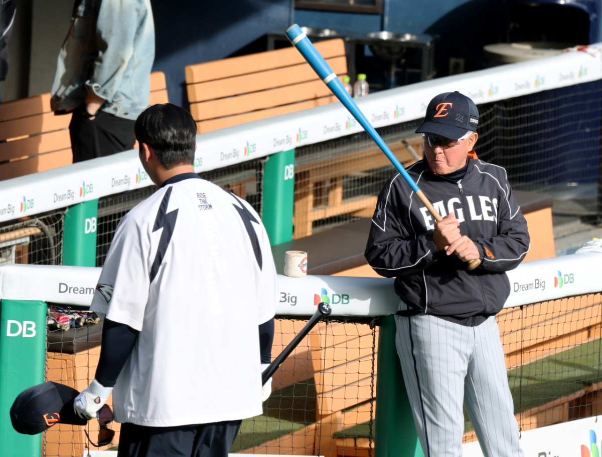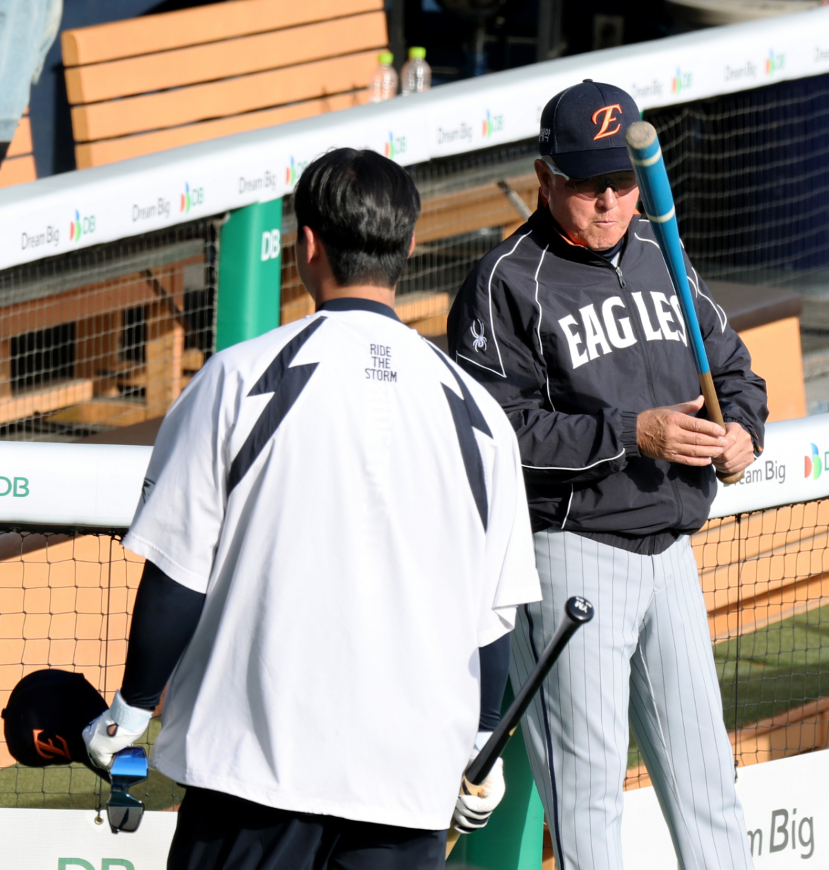 1군 복귀전 선발등판하는 한화 노시환이 23일 잠실야구장에서 열리는 2026 KBO리그 LG트윈스와 한화이글스 경기에 앞서 타격훈련을 한 후 더그아웃으로 들어가던 중 김경문 감독에 인사를 하고 있다. 2026.04.23.