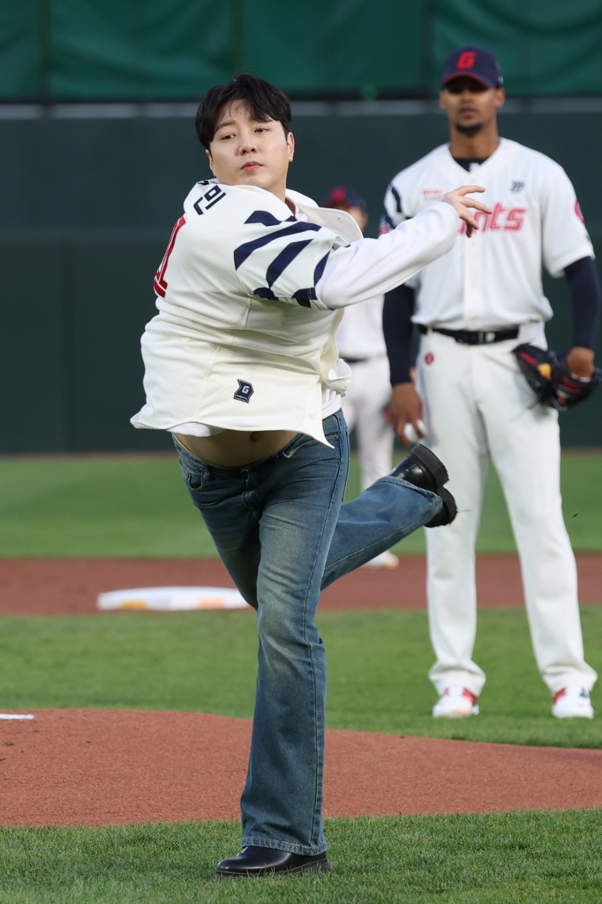 트로트 가수 강설민이 롯데 승리기원 시구를 하고 있다.