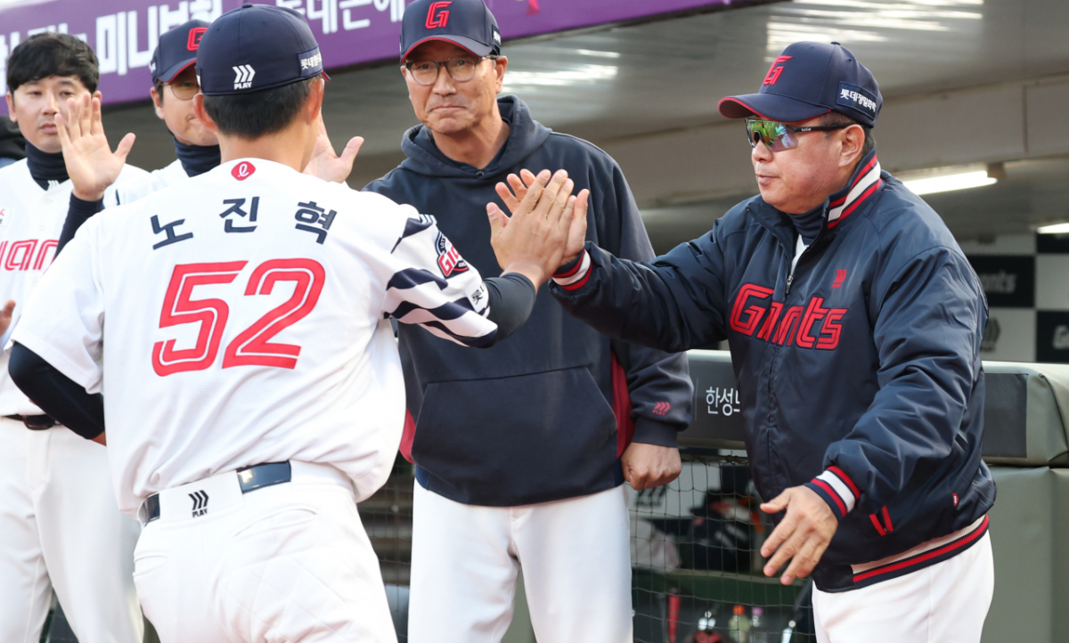 23일 부산 사직야구장에서 2026 신한 SOL KBO리그 롯데 자이언츠 대 두산 베어스 경기가 열렸다. 롯데 노진혁은 1000 경기 출장 달성을 수상했다. 김태형 감독은 노진혁의 수상을 축하했다.