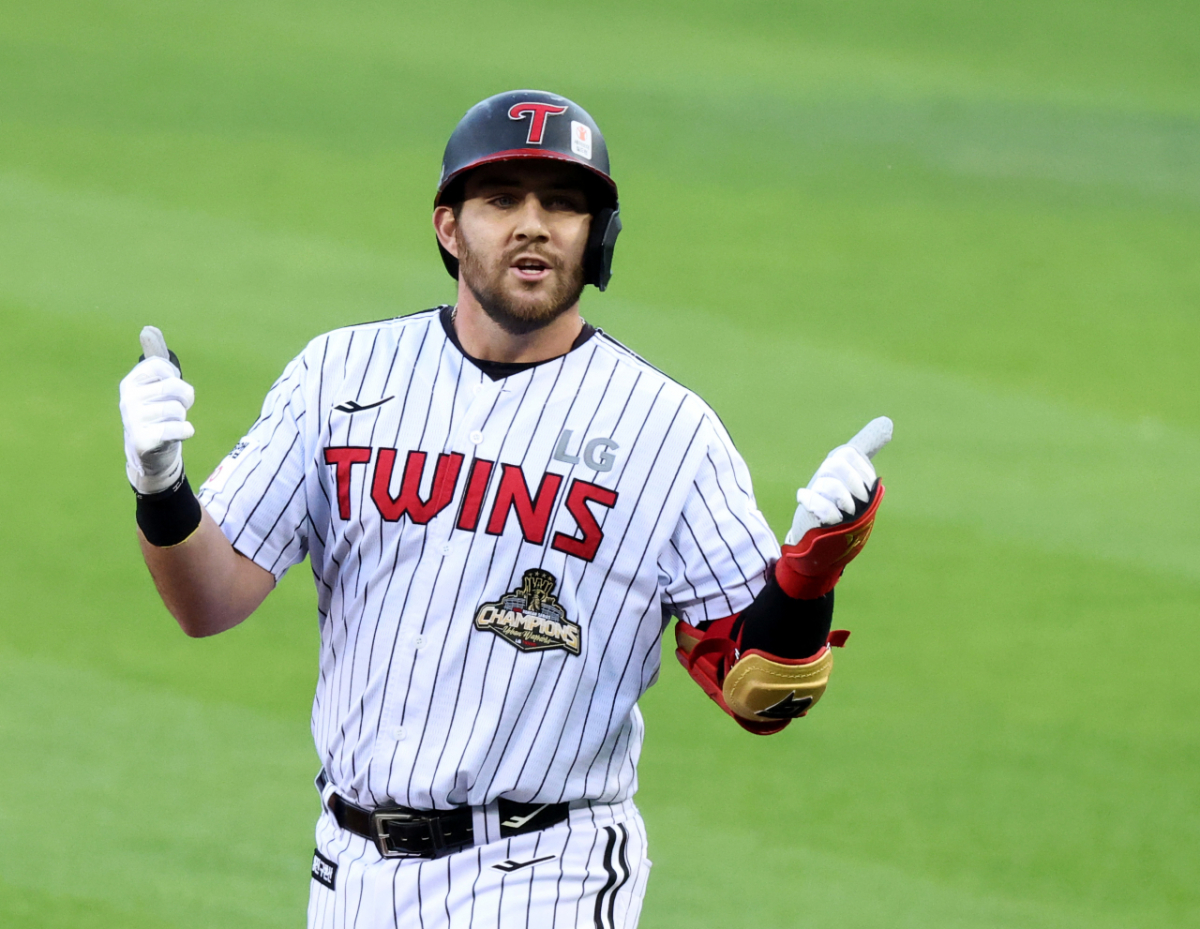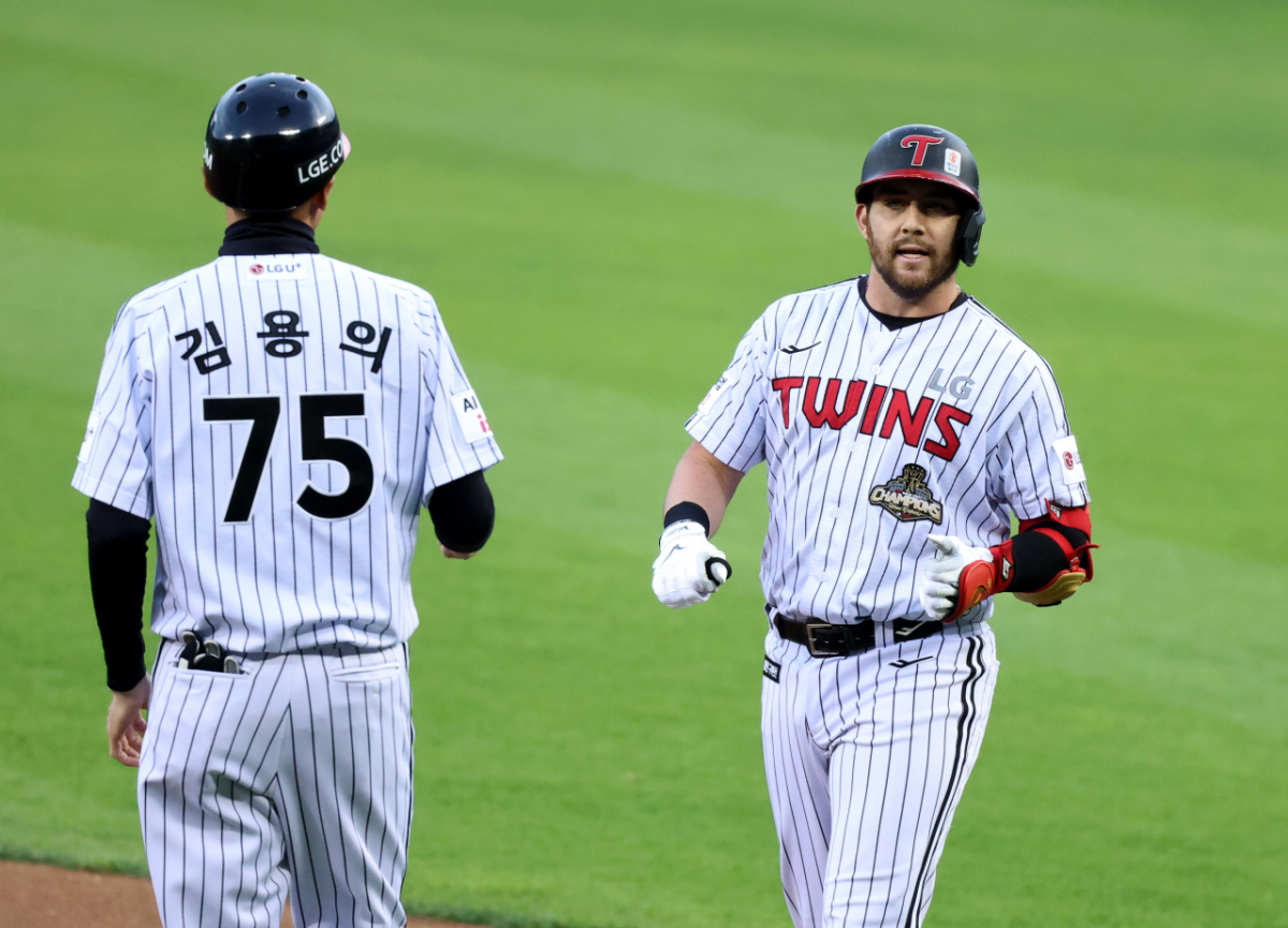 LG 3번타자 오스틴이 23일 잠실야구장에서 열린 2026 KBO리그 LG트윈스와 한화이글스 경기 1회말 무사 3루에서 적시타를 쳤다. 그는 적시타를 친 후 자축했다. 이로써 오스틴은 내야안타로 타점을 올렸다.