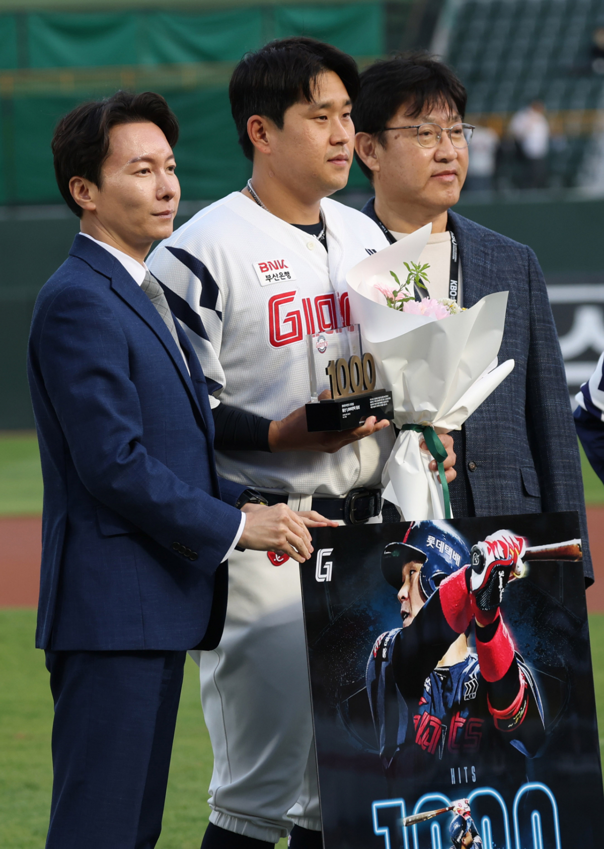 23일 부산 사직야구장에서 2026 신한 SOL KBO리그 롯데 자이언츠 대 두산 베어스 경기가 열렸다. 롯데 유강남이 1000 안타 출장 달성을 수상했다. 유강남은 수상 후 기념촬영을 했다.