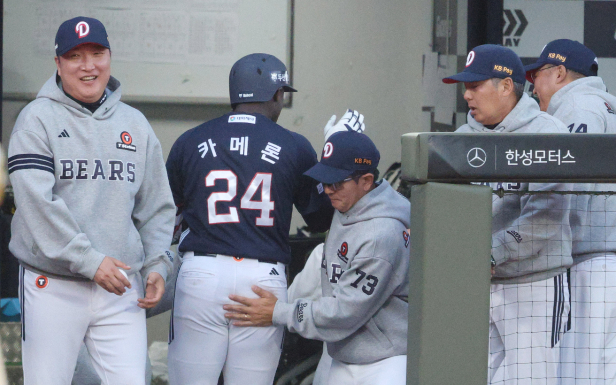 23일 부산 사직야구장에서 2026 신한 SOL KBO리그 롯데 자이언츠 대 두산 베어스 경기가 열렸다. 두산 카메론은 2회초 무사에서 선제 중월 1점 홈런을 날렸다. 카메론은 홈인한 후 손시현 코치의 환영을 받았다.