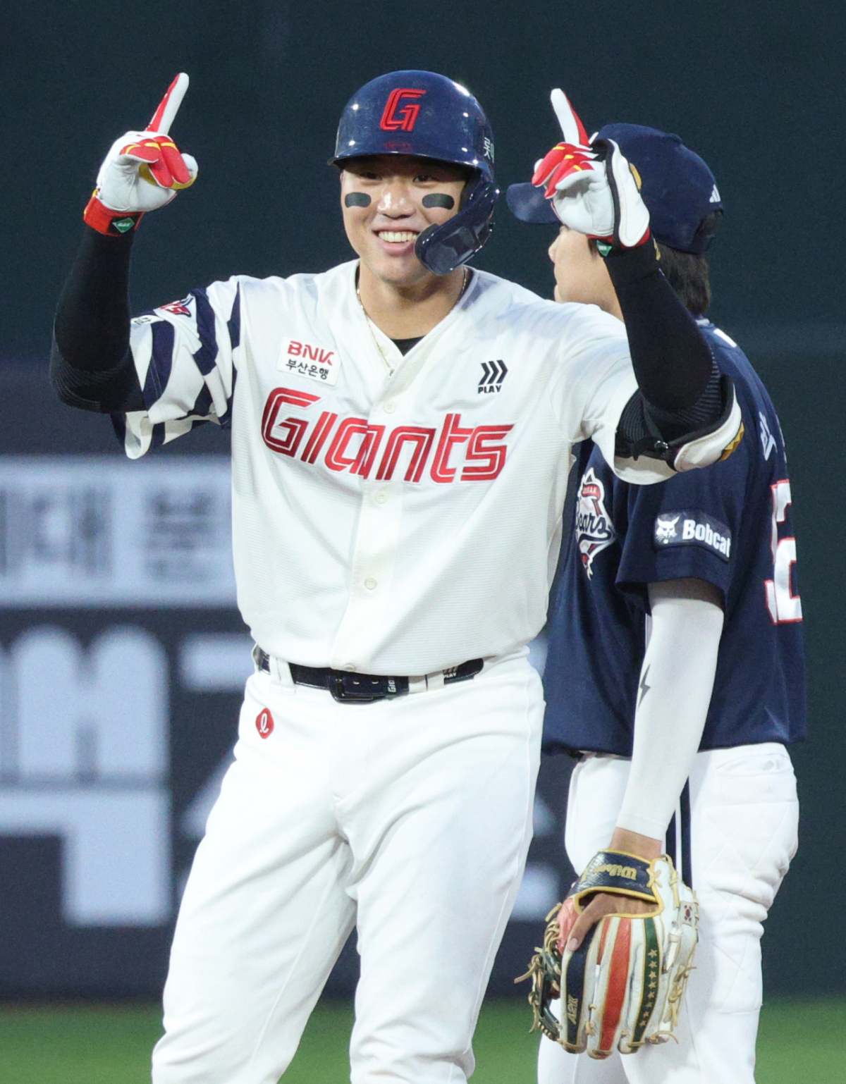 롯데 손성빈이 2회말 2사 1루에서 동점 1타점 적시 2루타를 날리고 출루한 후 세리머니를 하고 있다.