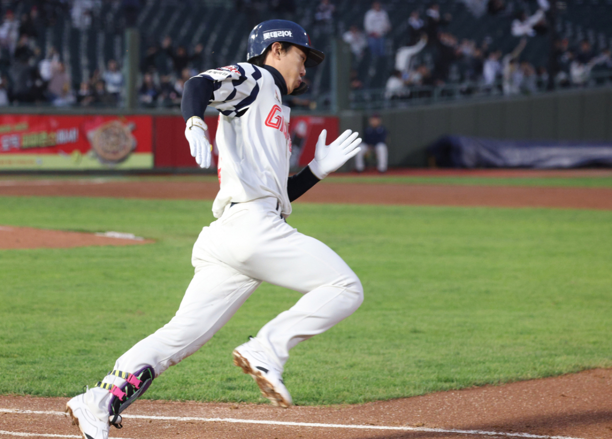 롯데 전민재가 2회말 2사 2루에서 역전 1타점 적시 2루타를 날리고 질주하고 있다.