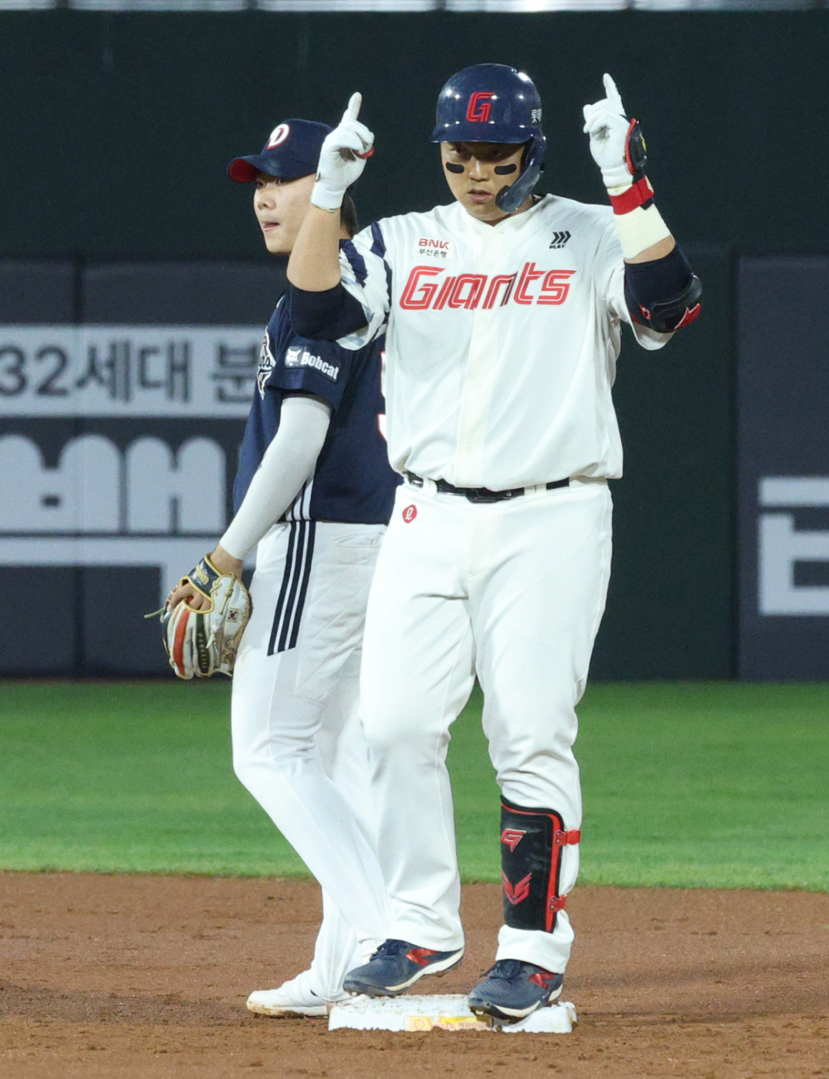 23일 부산 사직야구장에서 2026 신한 SOL KBO리그 롯데 자이언츠 대 두산 베어스 경기가 열렸다. 롯데 한동희는 3회말 2사에서 좌월 2루타를 날렸다. 한동희는 출루 후 세리머니를 했다.