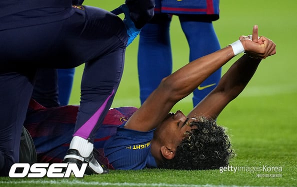 라민 야말(18, 바르셀로나)은 22일(한국시간) 라리가 경기에서 셀타 비고를 상대로 페널티킥 골을 성공시킨 직후 갑작스럽게 허벅지 뒤쪽 통증을 호소하며 쓰러졌다. 그는 골을 넣은 직후 세리머니도 하지 못한 채 곧바로 그라운드에 주저앉아 의료진을 호출했다. 이후 치료를 받은 뒤 스스로 걸어나오긴 했지만, 더 이상 경기를 소화하지 못하고 교체됐다.