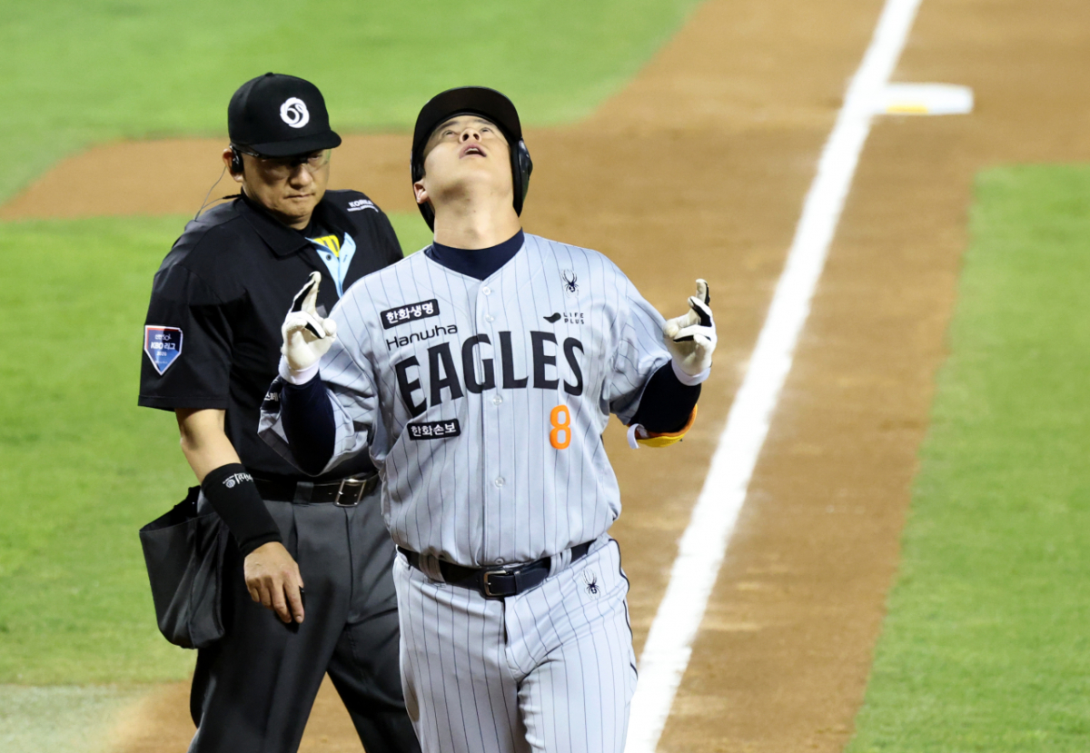 한화 4번타자 노시환이 23일 잠실야구장에서 열린 2026 KBO리그 LG트윈스와 한화이글스 경기에서 1군 복귀 후 홈런을 쳤다. 노시환은 4회초 1사 후 함덕주를 상대로 좌중월 솔로홈런을 터트렸다. 이 홈런으로 한화는 2-2 동점을 만들었다. 1군에 전격 복귀한 한화 4번타자 노시환이 23일 잠실야구장에서 열리는 2026 KBO리그 LG트윈스와 한화이글스 경기 4회초 1사후 함덕주를 상대로 좌중월 솔로홈런을 터트린 후 홈인하고 있다. 2-2 동점을 만든 한화.2026.04.23. 독자들의 PICK! 허니문 베이비 '출생의 비밀'...결혼 직전 전남친 만난 아내 소유, 임영웅과 '제주도 열애설' 전말 공개 '음주 뺑소니' 김호중, 옥중 50억 돈방석?…지분가치 '반전' 남편 방에 정력제..."아들아, 인생 즐겨" 불륜 응원한 시모