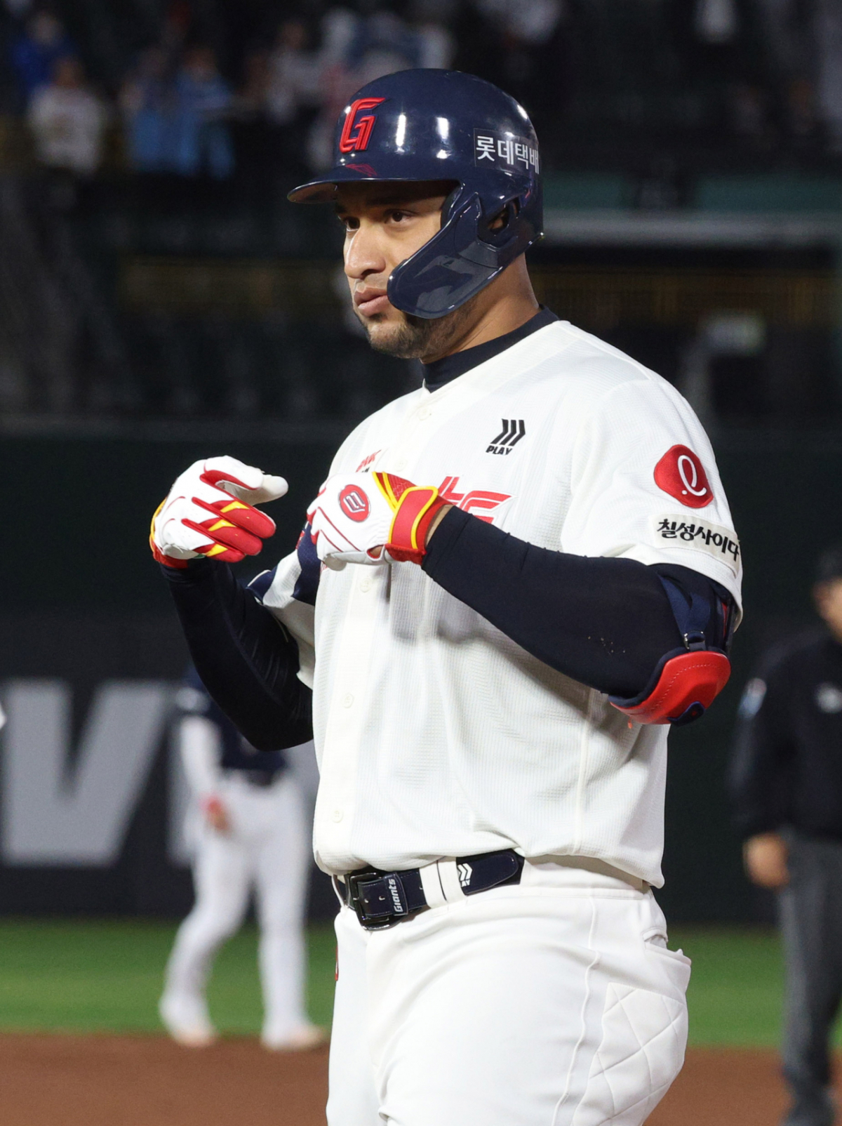 롯데 레이예스가 4회말 2사 2루에서 1타점 적시타를 날리고 출루한 후 세리머니를 하고 있다.