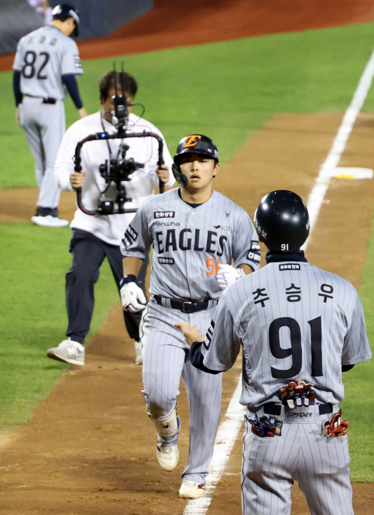 한화의 3번 타자 문현빈이 23일 잠실야구장에서 열린 2026 KBO리그 LG트윈스와 한화이글스 경기 5회초에 우월 솔로홈런을 터트렸다. 문현빈은 홈런을 친 후 홈인했다. 이 홈런으로 한화는 4-2로 LG에 리드했다. 한화 3번타자 문현빈이 23일 잠실야구장에서 열힌 2026 KBO리그 LG트윈스와 한화이글스 경기 5회초 우월 솔로홈런을 터트린 후 홈인하고 있다. 4-2로 리드하는 한화. 2026.04.23. 독자들의 PICK! 허니문 베이비 '출생의 비밀'...결혼 직전 전남친 만난 아내 소유, 임영웅과 '제주도 열애설' 전말 공개 '음주 뺑소니' 김호중, 옥중 50억 돈방석?…지분가치 '반전' 남편 방에 정력제..."아들아, 인생 즐겨" 불륜 응원한 시모
