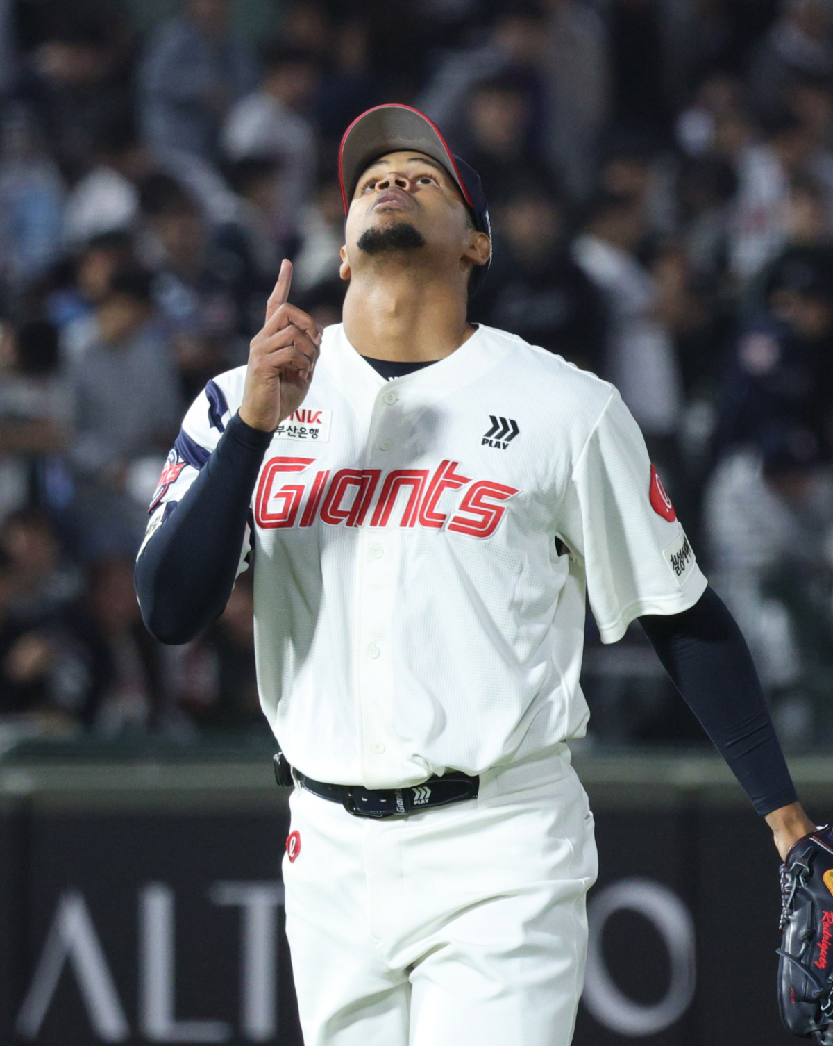 롯데 선발 로드리게스가 6회초 2사에서 두산 양석환을 삼진으로 돌려세운 후 기뻐하고 있다.