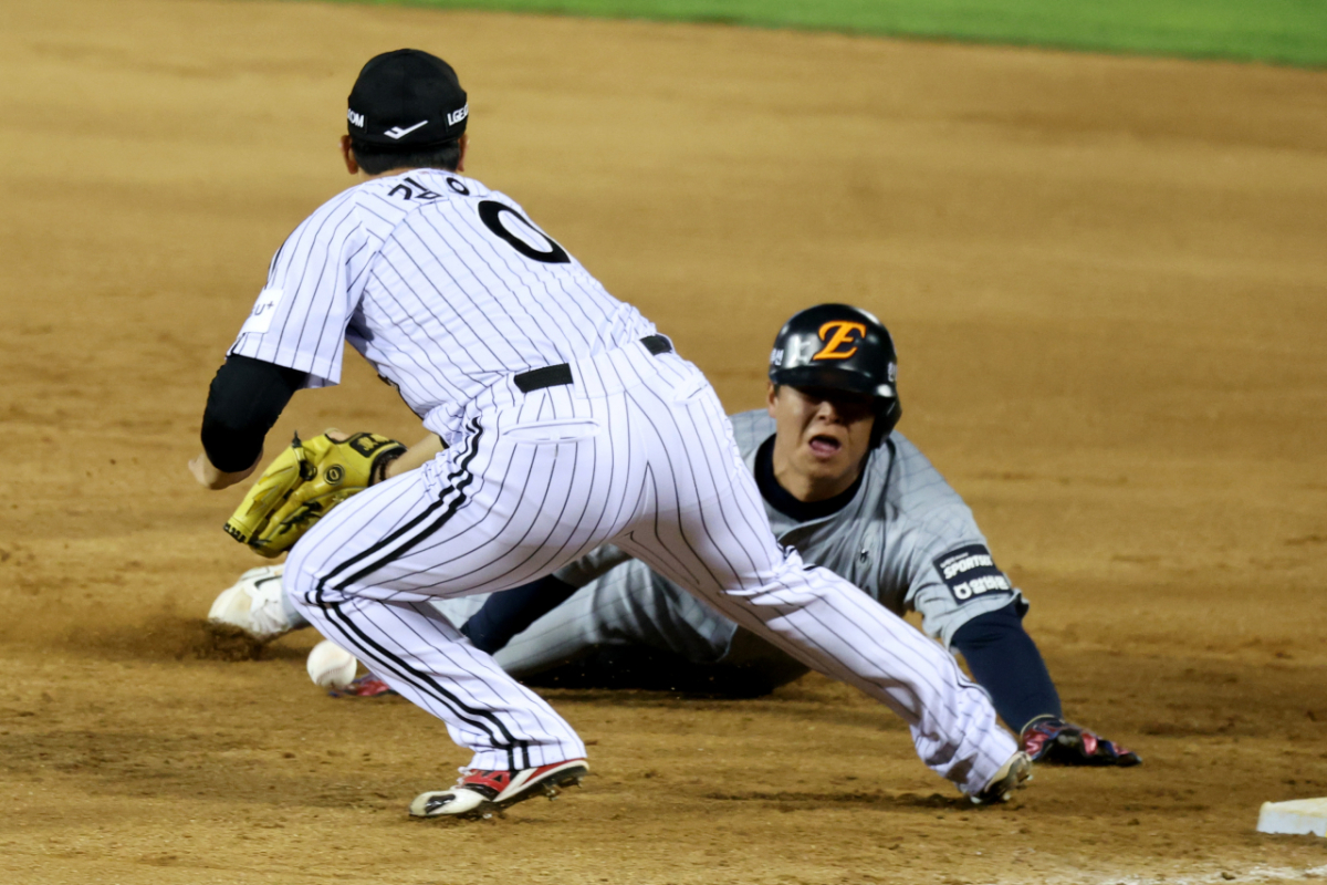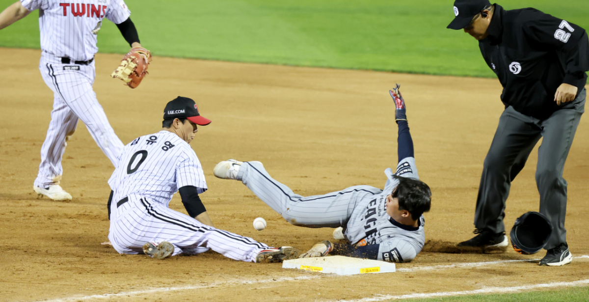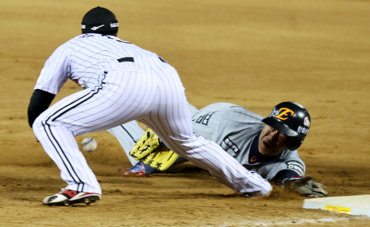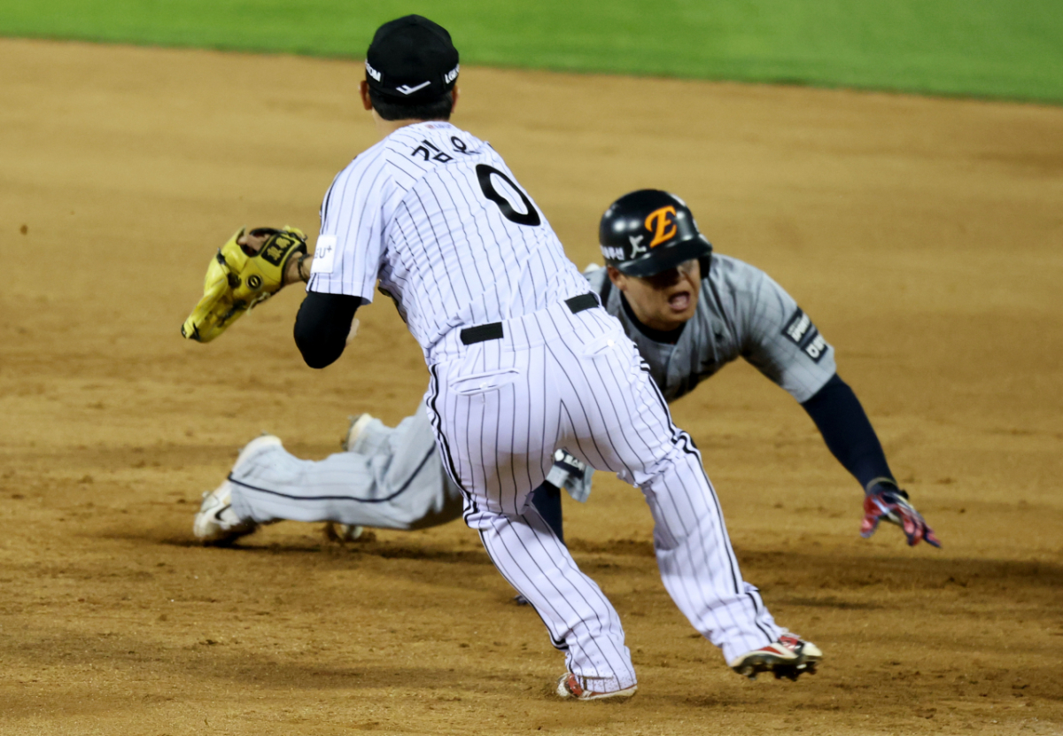 안타로 출루한 힌화 4번타자 노시환이 23일 잠실야구장에서 열힌 2026 KBO리그 LG트윈스와 한화이글스 경기 7회초 1사 강백호 삼진때 1-2루 협살에 걸렸으나 절묘하게 귀루해 세이프되고 있다.