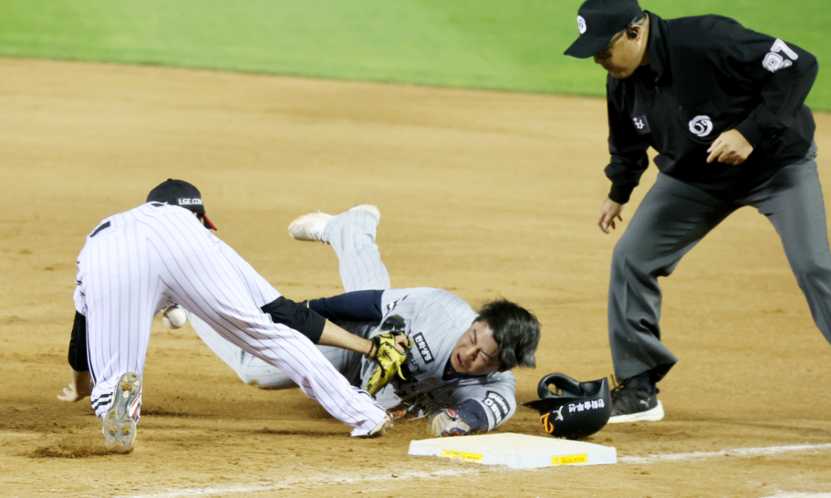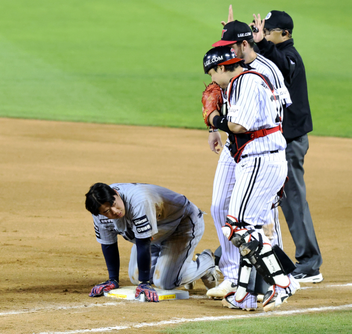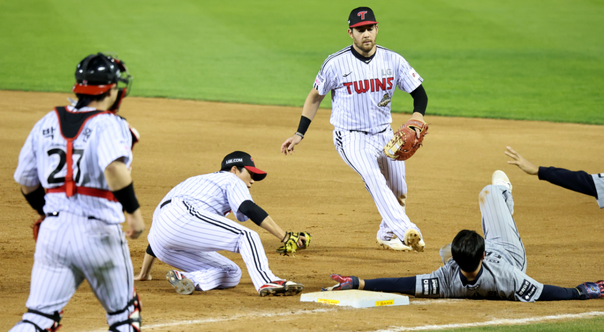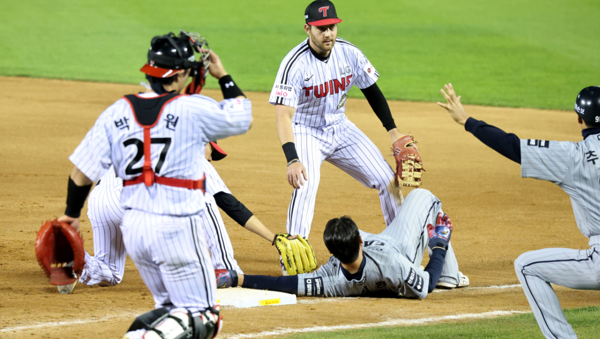 안타로 출루한 힌화 4번타자 노시환이 23일 잠실야구장에서 열힌 2026 KBO리그 LG트윈스와 한화이글스 경기 7회초 1사 강백호 삼진때 1-2루 협살에 걸렸으나 절묘하게 귀루해 세이프되고 있다.