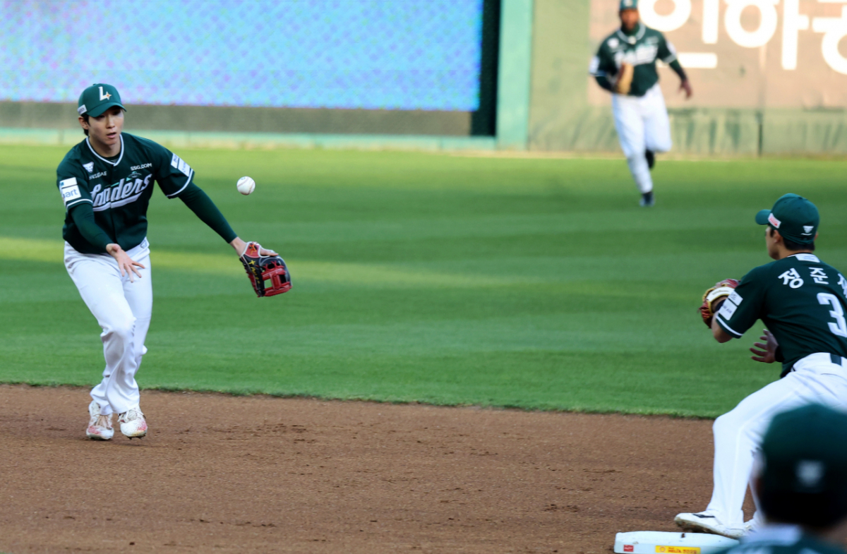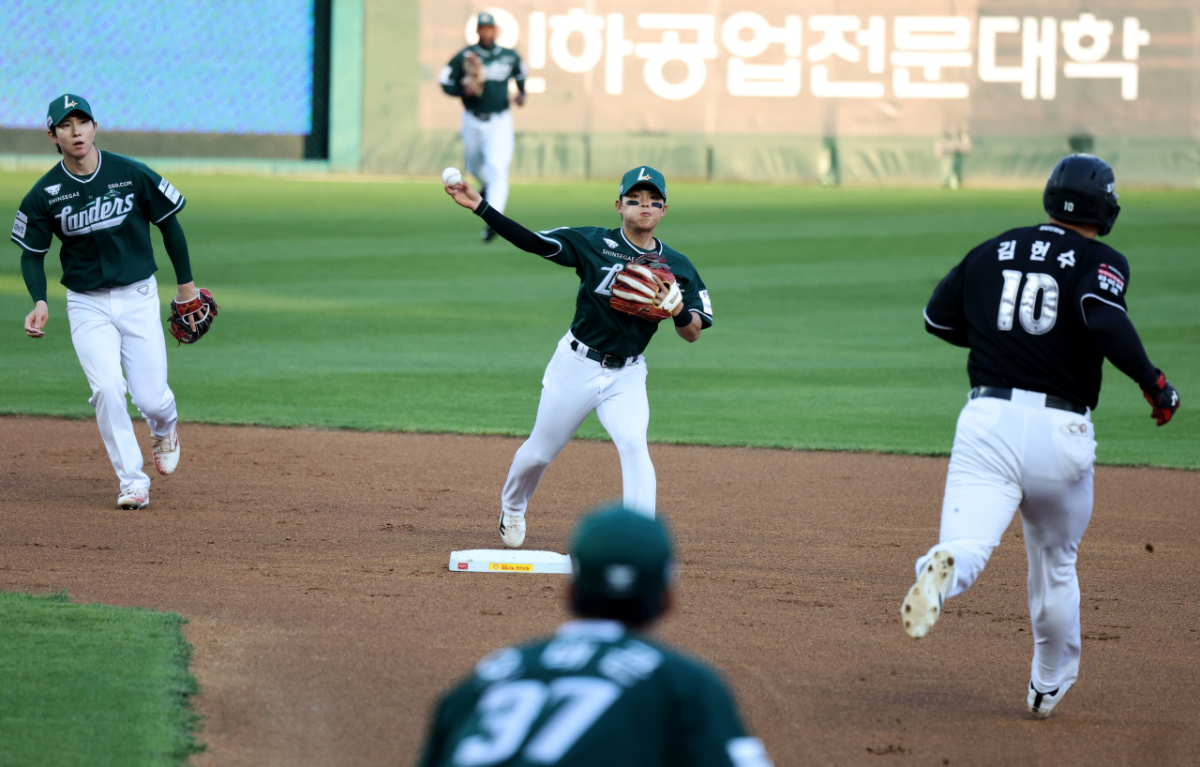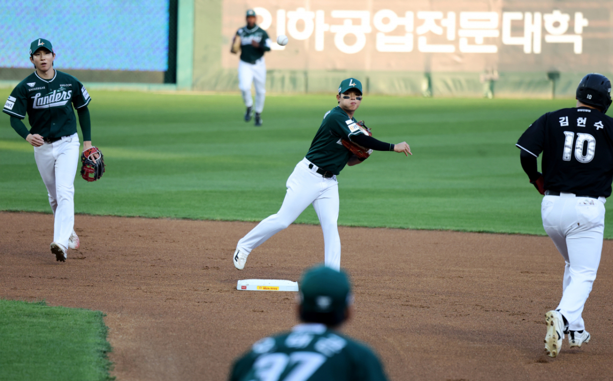 랜더스 2루수 정준재가 24일 랜더스필드에서 열린 2026KBO리그 SSG랜더스와 KT위즈 경기 1회초 1사 1,2루 KT 4번타자 장성우 유격수앞땅볼때 1루주자 김현수를 2루포스아웃시킨 후 1루로 송구하고 있다. 2026.04.24.