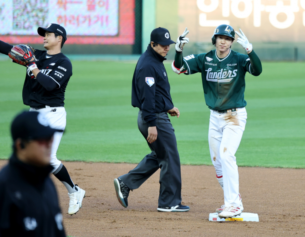 랜더스 1번타자 박성한이 24일 랜더스필드에서 열린 2026 KBO리그 SSG랜더스와 KT위즈 경기 1회말 선두타자로 나와 보쉴리를 상대로 2루타를 터트렸다. 박성한은 개막 이후 안타 행진을 이어오며 22경기 연속 안타를 기록했다. 그는 자신이 생각해도 미쳤다고 말했다.