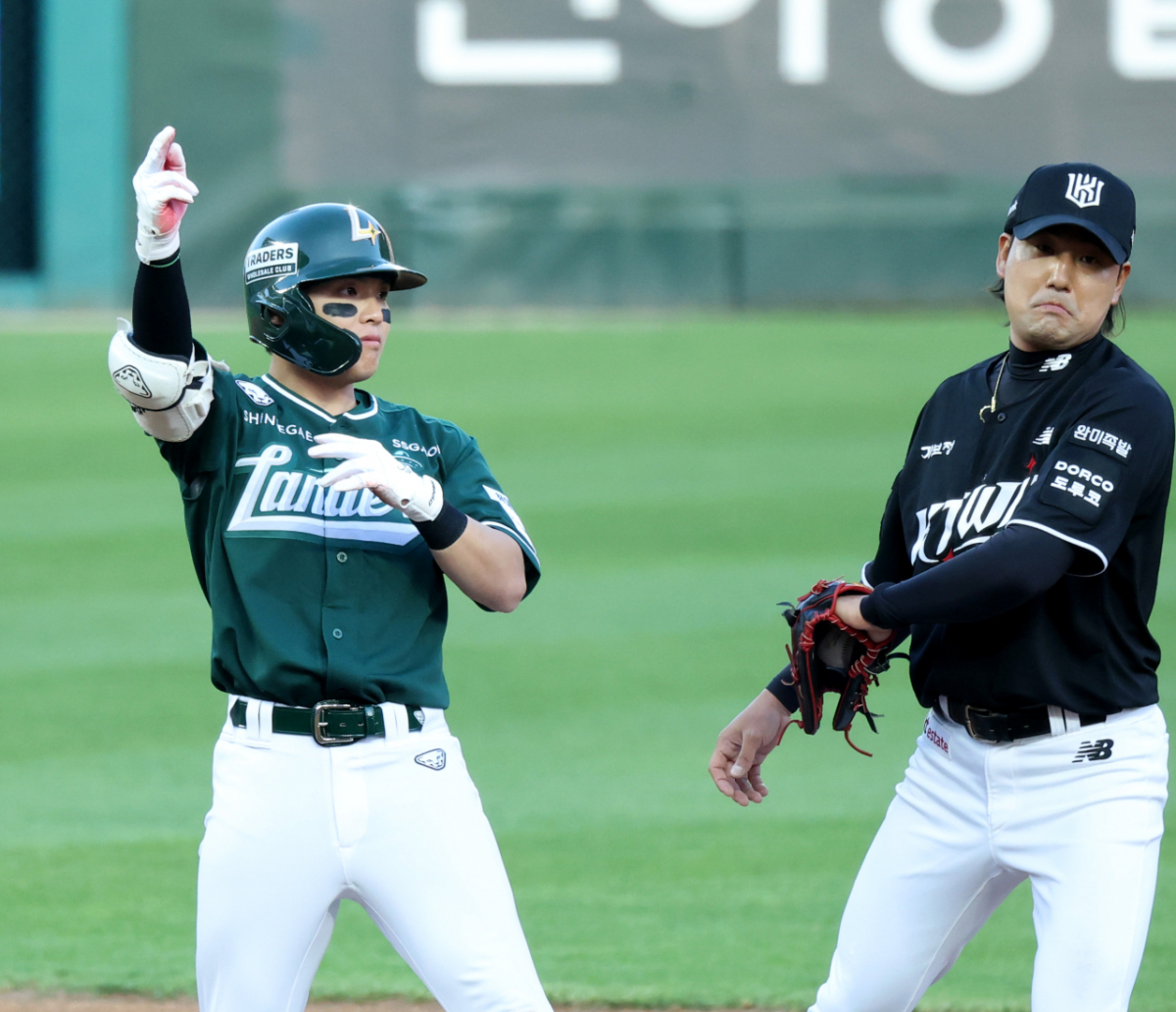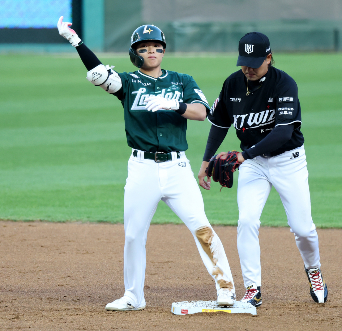 랜더스 2번타자 정준재가 24일 랜더스필드에서 열린 2026KBO리그 SSG랜더스와 KT위즈 경기 1회말 무사 2루에서 1타점 2루타로 출루하며 자축하고 있다. 2026.04.24.