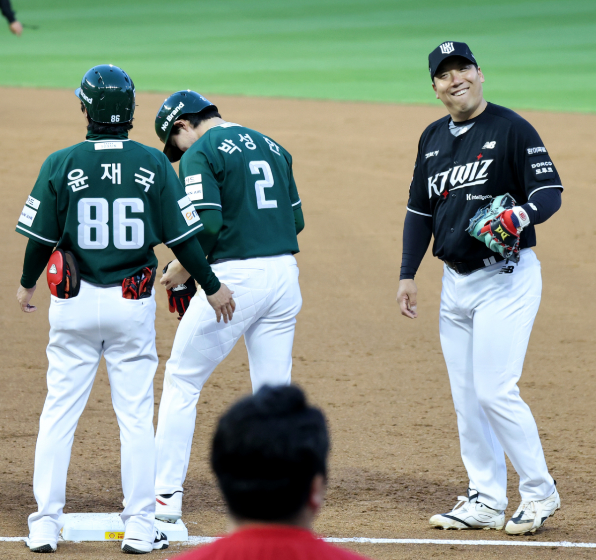 안타머신 김현수가 24일 랜더스필드에서 열린 2026KBO리그 SSG랜더스와 KT위즈 경기에서 박성한이 1회 개막22경기연속안타에 이어 3회에도 안타를 터트리자 고개를 절래절래 흔들고 있다. 2026.04.24.