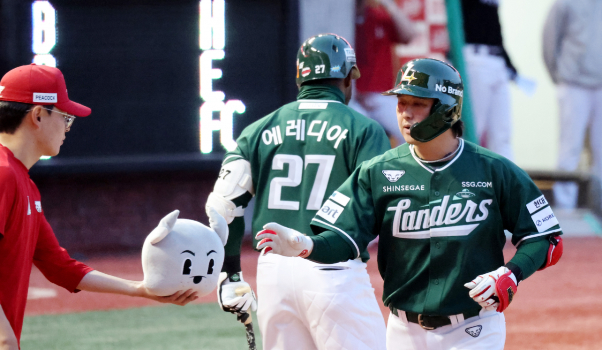 랜더스 3번타자 최정이 24일 랜더스필드에서 열린 2026KBO리그 SSG랜더스와 KT위즈 경기 3회말 선두타자로 나와 보쉴리를 상대로 솔로홈런을 터트린 후 홈인하고 있다. 2026.04.24.
