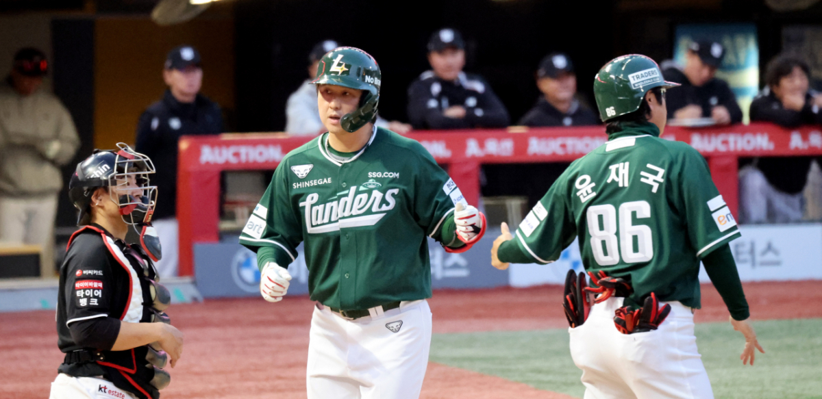 랜더스 3번타자 최정이 24일 랜더스필드에서 열린 2026KBO리그 SSG랜더스와 KT위즈 경기 3회말 선두타자로 나와 보쉴리를 상대로 솔로홈런을 터트린 후 홈인하고 있다. 2026.04.24.