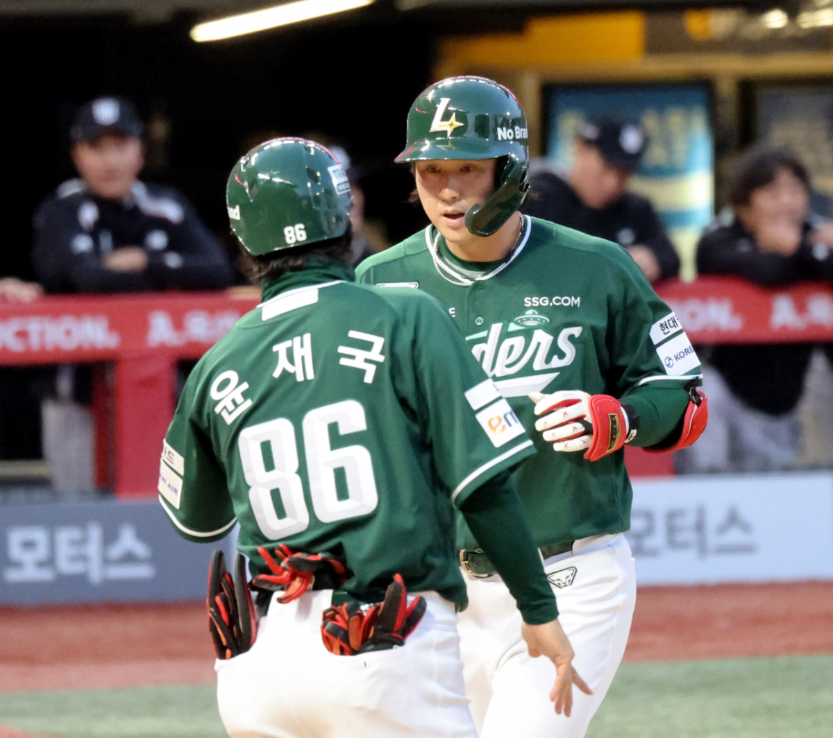 랜더스 3번타자 최정이 24일 랜더스필드에서 열린 2026KBO리그 SSG랜더스와 KT위즈 경기 3회말 선두타자로 나와 보쉴리를 상대로 솔로홈런을 터트린 후 홈인하고 있다. 2026.04.24.