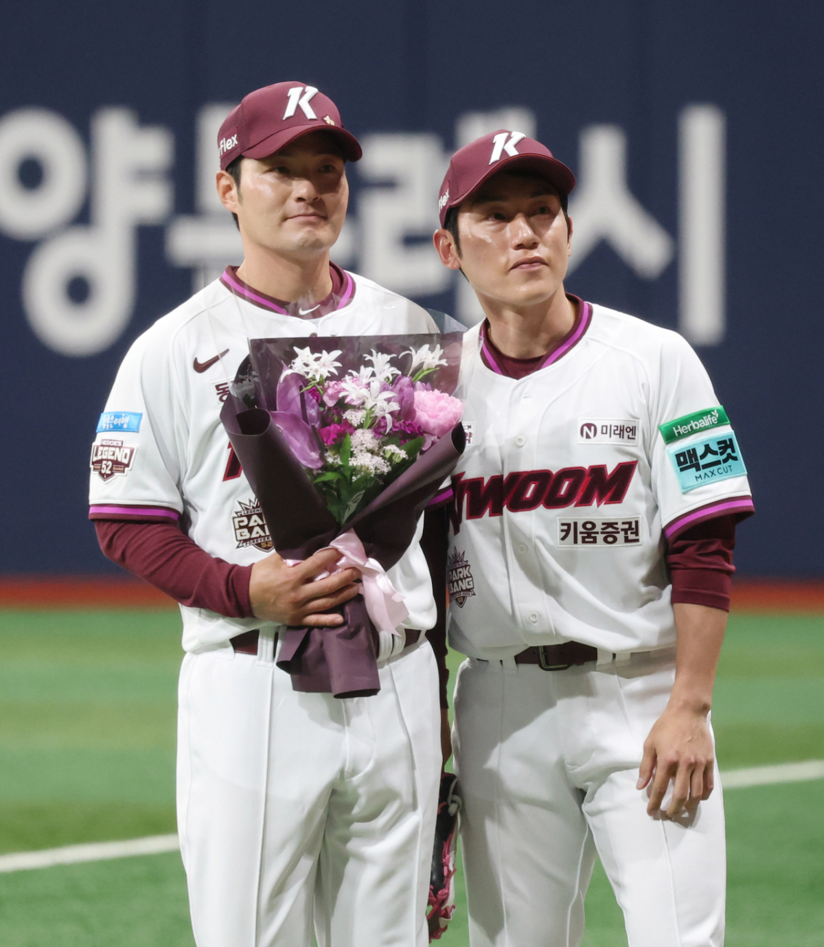 26일 서울 고척스카이돔에서 2026 신한 SOL KBO리그 키움 히어로즈 대 삼성 라이온즈 경기가 열렸다. 키움 박병호는 1회초 수비 후 삼성 타자가 타석에 들어서자 교체됐다. 박병호는 서건창에게 꽃다발을 받았다.