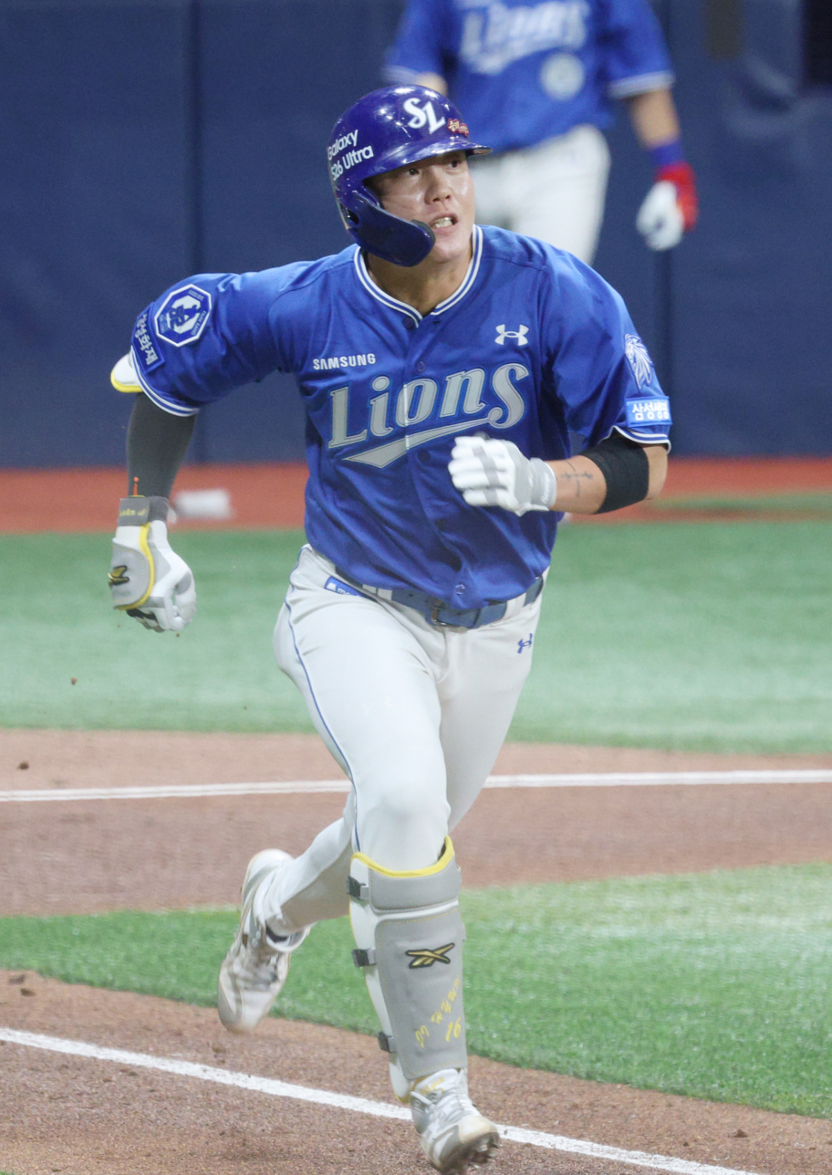 삼성 류지혁이 힘차게 타격한 후 질주하고 있다.