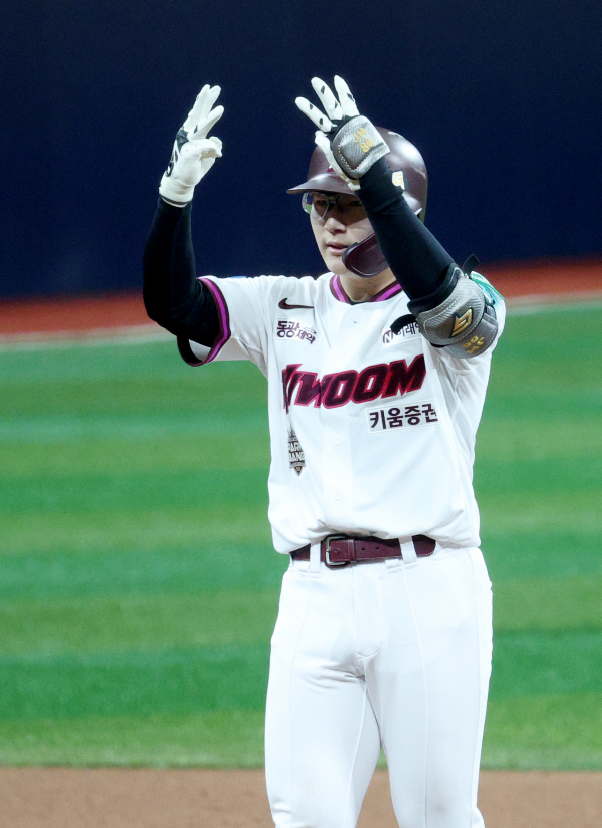 키움 송지후가 3회말 1사에서 좌월 2루타를 날리고 출루한 후 세리머니를 하고 있다.