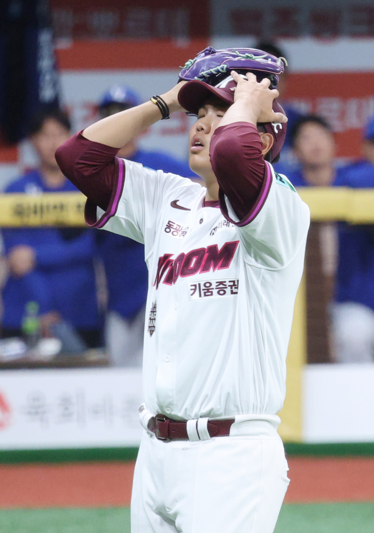 키움 박정훈이 8회초 실점 위기를 넘기며 이닝을 마무리한 후 감격해하며 더그아웃으로 향하고 있다.