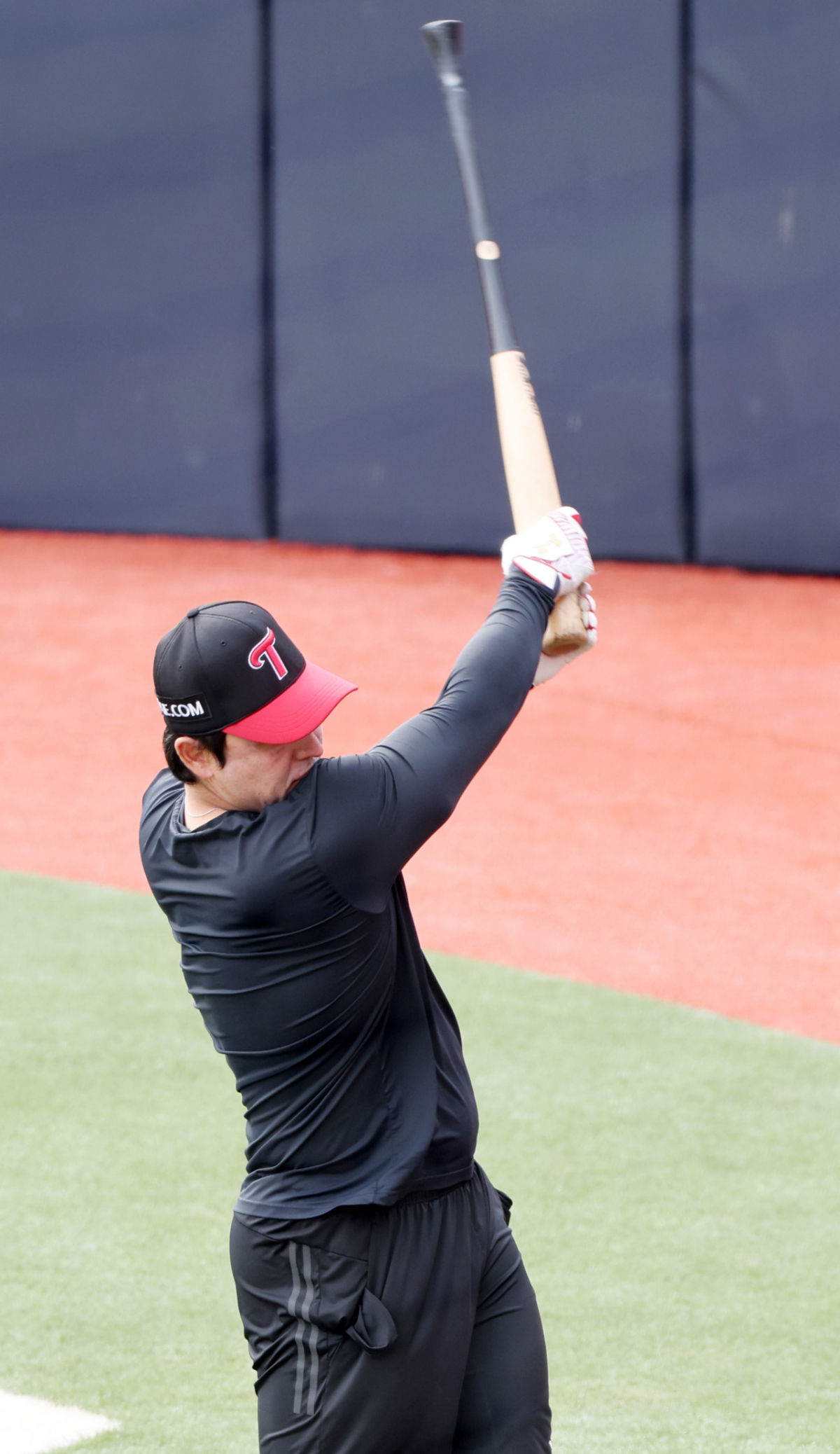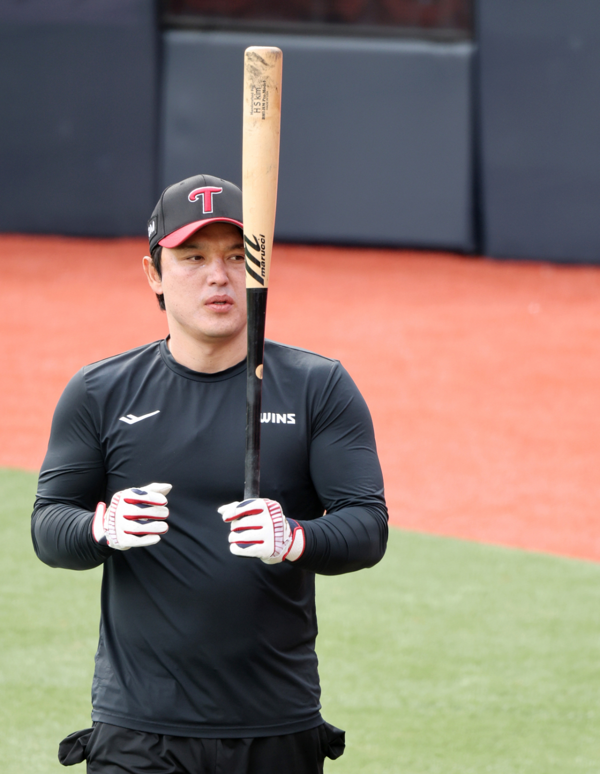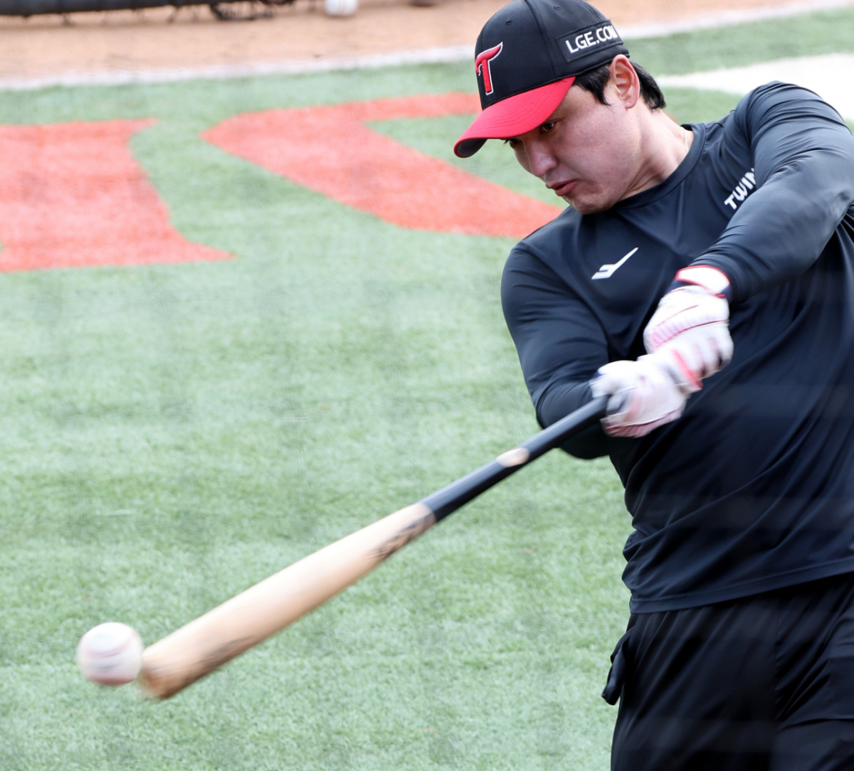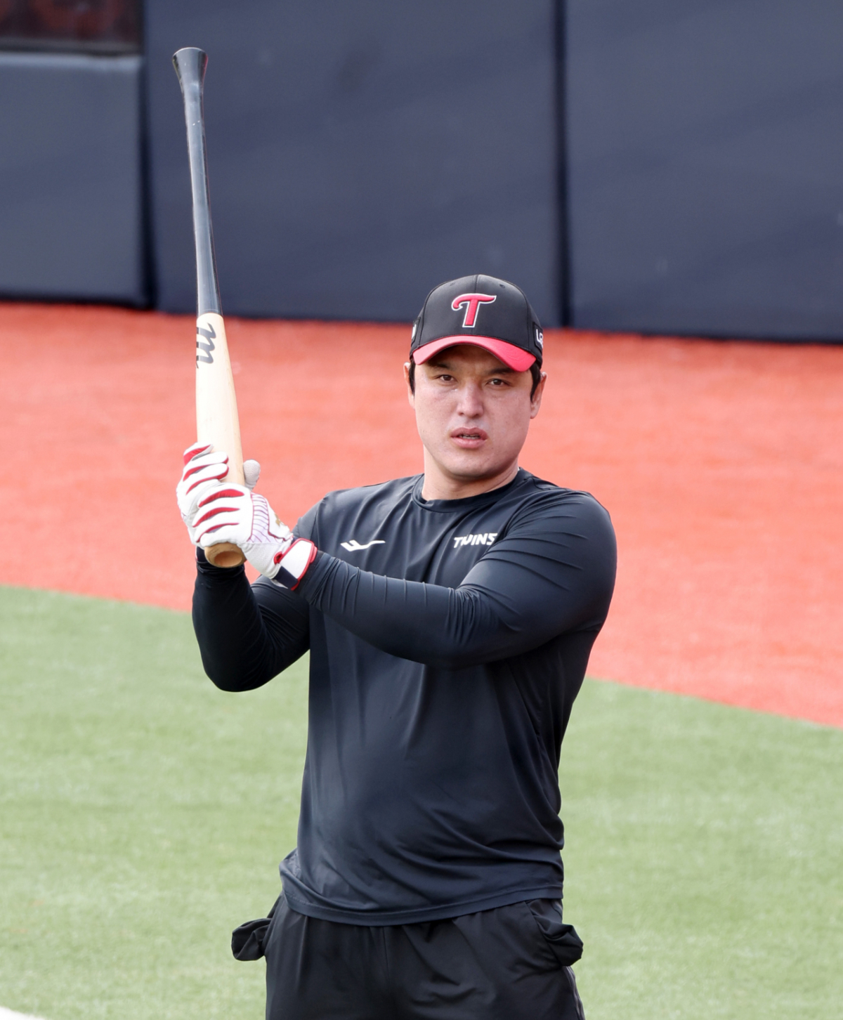 LG 포수 박동원이 28일 수원KT위즈파크에서 열린 2026KBO리그 LG트윈스와 KT위즈 경기에 앞서 방망이를 거꾸로 잡고 테니스볼을 치며 타격훈련을 하고 있다. 2026.04.28.