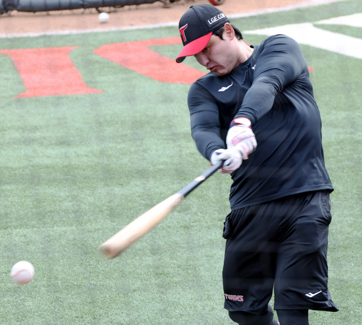 LG 포수 박동원이 28일 수원KT위즈파크에서 열린 2026KBO리그 LG트윈스와 KT위즈 경기에 앞서 훈련했다. 그는 방망이를 거꾸로 잡고 테니스볼을 치며 타격훈련을 했다. 이 훈련은 2026년 4월 28일에 진행되었다.